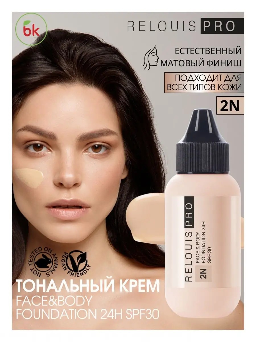 RELOUIS PRO FACE&BODY FOUNDATION 24H SPF 30 from the popular Belarusian brand of decorative cosmetics Relouis. This foundation with a comfortable texture for any skin type spreads easily, creating a base for perfect makeup. SPF 30 is the most universal level of protection for both summer and winter. 24-hour durability makes the texture ideal for any occasion. The texture is easy to layer, allowing you to create a tone from medium to dense, smooth out any imperfections and highlight the skin's advantages. A natural matte finish, the texture looks natural without a mask effect. A fluid that does not dry out the skin, does not run, does not roll, and does not clog pores. It stays in place all day. Easily spreads, creating a base for perfect makeup, guarantees a facetune effect and helps skin look perfect in photos. 1C (c - cold) - a light cool shade for fair skin with a cool undertone that hardly tans. 2N (n – neutral) – a medium neutral universal shade for medium skin with a neutral undertone. 2W (w – warm) – a medium olive shade for sun-loving, warm-toned medium skin. Vegan, oil-free foundation. Try mixing the shades together to create your own perfect shade. How to use: Shake before use, apply the cream with a damp sponge or brush to the face and/or exposed areas of the body, and blend.