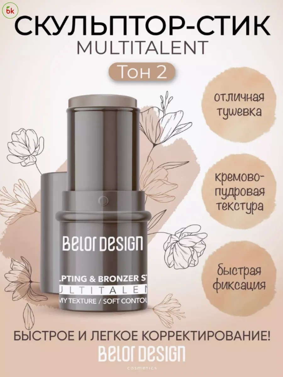 Многофункциональный скульптор-стик MULTITALENT от белорусского бренда декоративной косметики Belor Design ( Белор Дизайн). Формат толстого карандаша-стика позволит быстро скорректировать черты лица. Нежная кремово-пудровая текстура равномерно распределяется и быстро фиксируется на поверхности кожи, поддается тщательной растушевке, что позволяет добиться максимально естественного финиша. Кремовый стик в универсальном оттенке позволяет мягко и профессионально скорректировать рельеф лица. Формула скульптора легко адаптируется под любой цветотип кожи и позволяет наносить продукт на чистую кожу или поверх тональной основы. Специальный микс смягчающих ингредиентов защищает кожу от пересушивания. Тон 2 (оттенок «тауп») позволяет получить эффект естественной тени. Не имеет ширменных частиц. Нанести локально на необходимые участки, быстро растушевать. Варианты нанесения: кистью-дуофиброй, спонжем, для более тонкого эффекта - пальцами.