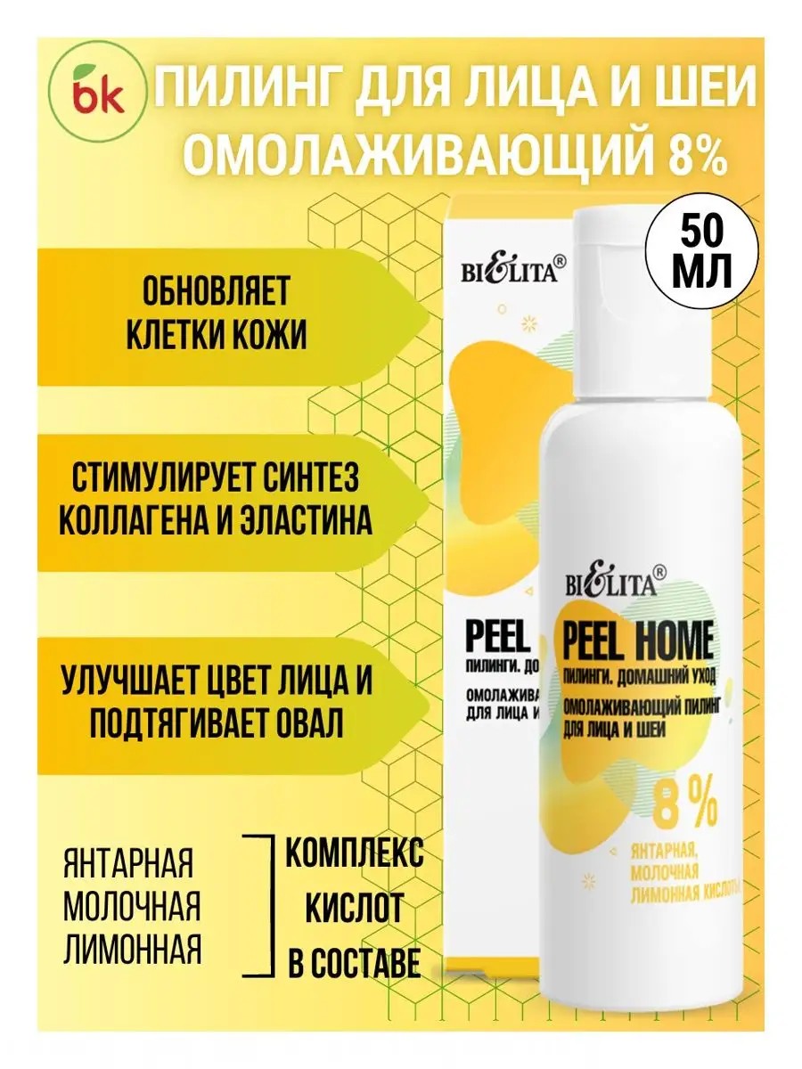 Омолаживающий пилинг для лица и шеи 8% янтарная, молочная, лимонная кислоты Peel Home от белорусского бренда косметики Белита — это настоящее открытие для вашей кожи. Его эффективный комплекс, состоящий из янтарной, молочной и лимонной кислот, запускает процессы обновления клеток, стимулирует выработку коллагена, эластина и гиалуроновой кислоты, а также активизирует обмен веществ.