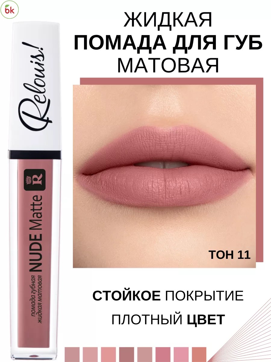 NUDE MATTE liquid matte lipstick from the Belarusian decorative cosmetics brand Relouis. A versatile, long-lasting lipstick for perfect everyday makeup and for going out! The mousse formula provides added comfort for your lips all day long! A palette of natural nude shades to suit every taste! Long-lasting matte finish and streak-free, saturated color! Treat your lips to stunning color and flawless texture! Application tip: To ensure matte lipstick wears evenly and doesn't highlight imperfections, prep your lips first. To do this, exfoliate your lips with a scrub. Immediately apply a nourishing balm or chapstick to moisturize and soften. It's best to do this 15 minutes before applying makeup. Apply the lipstick with a cosmetic brush or applicator in a thin layer. This way, the color will be distributed evenly, and your makeup will last longer.