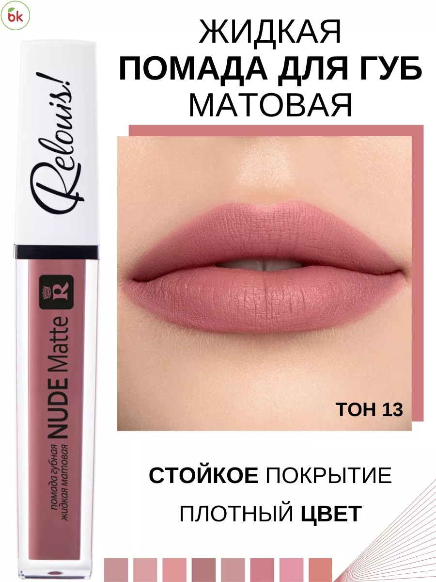 NUDE MATTE liquid matte lipstick from the Belarusian decorative cosmetics brand Relouis. A versatile, long-lasting lipstick for perfect everyday makeup and for going out! The mousse formula provides added comfort for your lips all day long! A palette of natural nude shades to suit every taste! Long-lasting matte finish and streak-free, saturated color! Treat your lips to stunning color and flawless texture! Application tip: To ensure matte lipstick wears evenly and doesn't highlight imperfections, prep your lips first. To do this, exfoliate your lips with a scrub. Immediately apply a nourishing balm or chapstick to moisturize and soften. It's best to do this 15 minutes before applying makeup. Apply the lipstick with a cosmetic brush or applicator in a thin layer. This way, the color will be distributed evenly, and your makeup will last longer.
