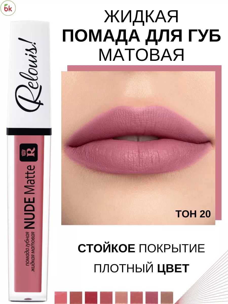 NUDE MATTE liquid matte lipstick from the Belarusian decorative cosmetics brand Relouis. A versatile, long-lasting lipstick for perfect everyday makeup and for going out! The mousse formula provides added comfort for your lips all day long! A palette of natural nude shades to suit every taste! Long-lasting matte finish and streak-free, saturated color! Treat your lips to stunning color and flawless texture! Application tip: To ensure matte lipstick wears evenly and doesn't highlight imperfections, prep your lips first. To do this, exfoliate your lips with a scrub. Immediately apply a nourishing balm or chapstick to moisturize and soften. It's best to do this 15 minutes before applying makeup. Apply the lipstick with a cosmetic brush or applicator in a thin layer. This way, the color will be distributed evenly, and your makeup will last longer.