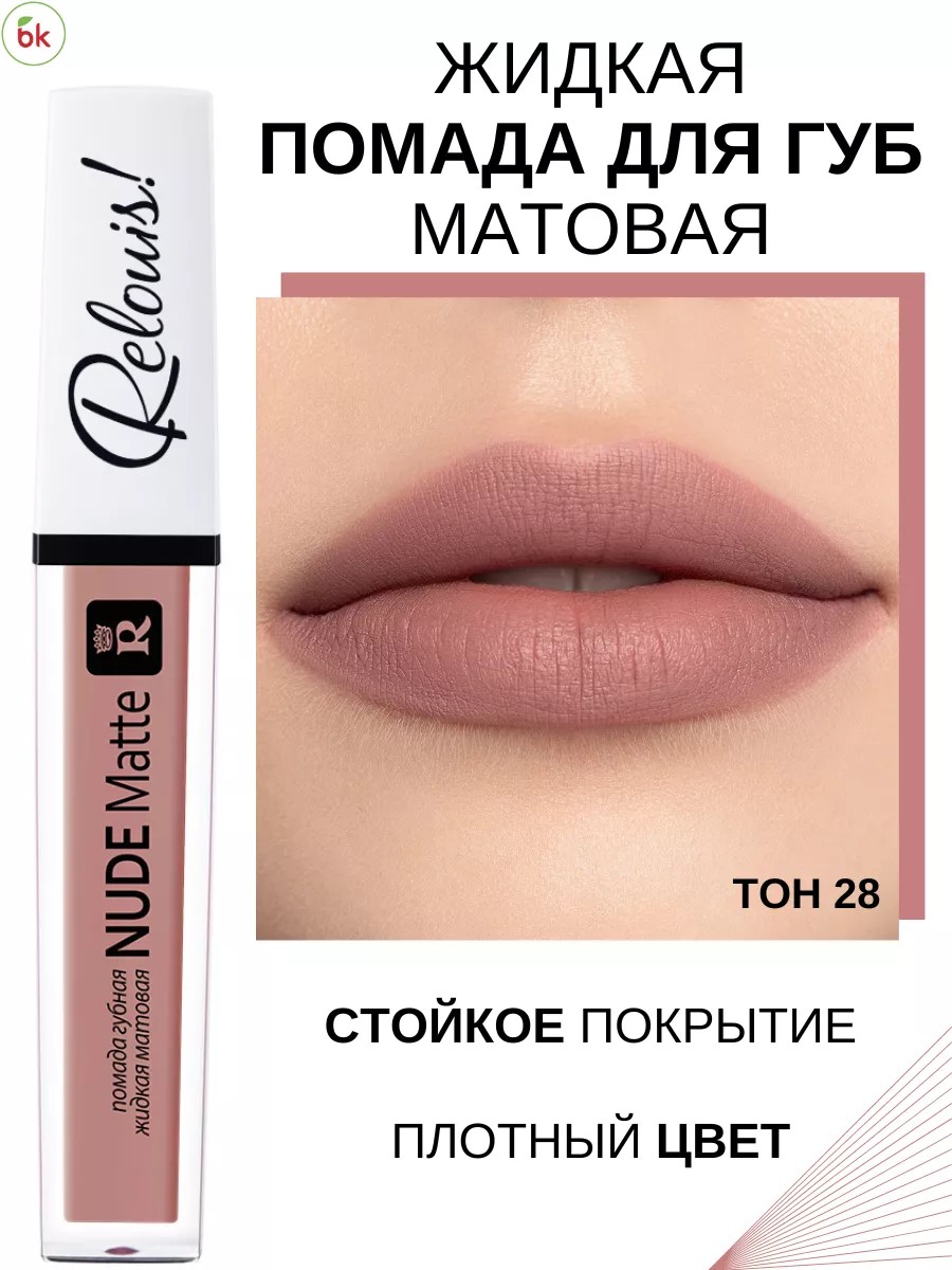 NUDE MATTE liquid matte lipstick from the Belarusian decorative cosmetics brand Relouis. A versatile, long-lasting lipstick for perfect everyday makeup and for going out! The mousse formula provides added comfort for your lips all day long! A palette of natural nude shades to suit every taste! Long-lasting matte finish and streak-free, saturated color! Treat your lips to stunning color and flawless texture! Application tip: To ensure matte lipstick wears evenly and doesn't highlight imperfections, prep your lips first. To do this, exfoliate your lips with a scrub. Immediately apply a nourishing balm or chapstick to moisturize and soften. It's best to do this 15 minutes before applying makeup. Apply the lipstick with a cosmetic brush or applicator in a thin layer. This way, the color will be distributed evenly, and your makeup will last longer.