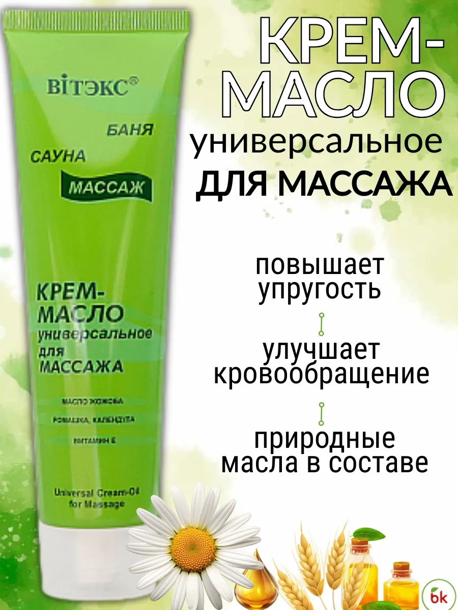 Крем-масло универсальное для массажа от белорусского бренда уходовой косметики Витэкс. Массажное масло основано на природных маслах (жожоба, календулы, ромашки), которые стимулируют периферическую микроциркуляцию. Крем для тела содержит масло семян подсолнуха, зародышей пшеницы, которые повышают барьерную функцию кожи, а также восстанавливают ее липидную мантию. После проведения курса массажа кожа становится гладкой и эластичной. Специальная программа «Баня, сауна, массаж» создана для проведения оздоровительных процедур, получения максимального удовольствия и хорошего самочувствия от общения с водой, освобождения от стресса и напряжения. Мощное сочетание эфирных масел, лечебных трав и оздоравливающих морских компонентов помогает Вам расслабиться, достичь гармонии души и тела.