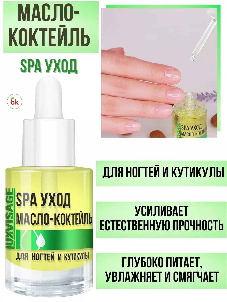Nail and Cuticle Oil Cocktail SPA Treatment with a pipette from the Belarusian decorative cosmetics brand Luxvisage. This oil deeply nourishes, moisturizes, and softens the cuticle. It protects the nail plate and the surrounding area from drying out and cracking. It enhances the natural strength and elasticity of the nail plate. Contains sweet almond oil, castor oil, natural extracts, and vitamins. Directions: Apply daily to the nail and cuticle area, massaging until completely absorbed.