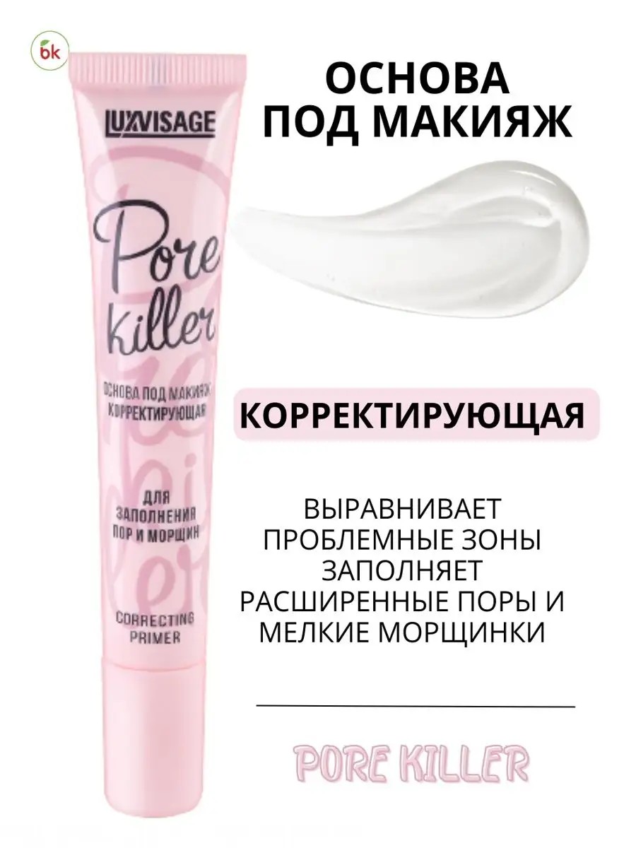 Pore Killer transparent makeup primer for filling pores and wrinkles from the popular Belarusian decorative cosmetics brand Luxvisage. Evens out problem areas. Fills in enlarged pores and fine wrinkles. The dense gel base of the base perfectly evens out problem areas of the face, fills in enlarged pores and expression lines. The skin becomes more even and silky. Creates a smooth surface for applying foundation, preventing foundation from "sinking" into pores and wrinkles. Effectively mattifies the skin in problem areas, controls the appearance of oily shine. Extends the durability of makeup, preventing foundation from "slipping". Suitable for all skin types, but especially relevant for oily and combination skin. Does not contain silicones, does not clog pores. Suitable for daily use. Smooth skin without enlarged pores and fine wrinkles!