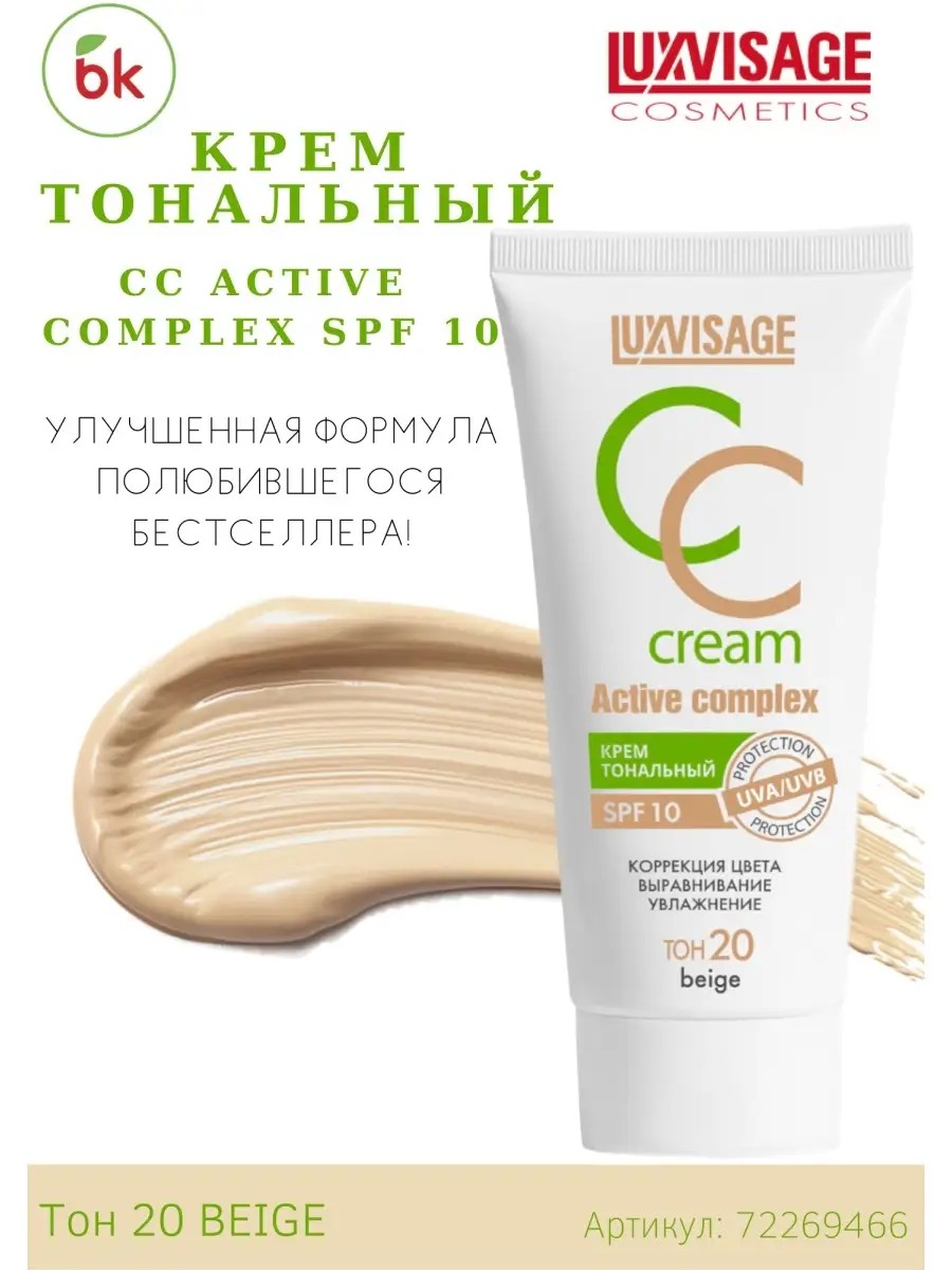 Крем тональный ДЛЯ ЛИЦА CC ACTIVE COMPLEX SPF 10 от белорусского бренда декоративной косметики Luxvisage (Люксвизаж). Корректирующий и выравнивающий тональный крем с солнцезащитным фактором SPF 10. Защищает кожу от УФ-излучения широкого спектра, вредного воздействия UVA и UVB-лучей, фотостарения. Идеально подстраивается под тон кожи, улучшает её естественный оттенок, обеспечивает максимальную цветокоррекцию. Уменьшает видимость расширенных капилляров, покраснений, скрывает пигментацию. Уникальные оптические микросферы, входящие в состав формулы превосходно выравнивают текстуру кожи, заполняют поры и мелкие морщинки. Создают естественный полуматовый финиш. Обладает легкой кремовой текстурой, не сушит кожу и дарит ей ощущение комфорта благодаря увлажняющему комплексу ElfaMoist. Отлично наносится и распределяется. Обладает средней степенью покрытия, позволяя наслаивать и регулировать его плотность. Стойко держится на коже весь день. Идеально подходит для сухой, чувствительной, смешанной и возрастной кожи. Нанесите крем на кожу лица, равномерно распределите пальцами, спонжем или кистью.