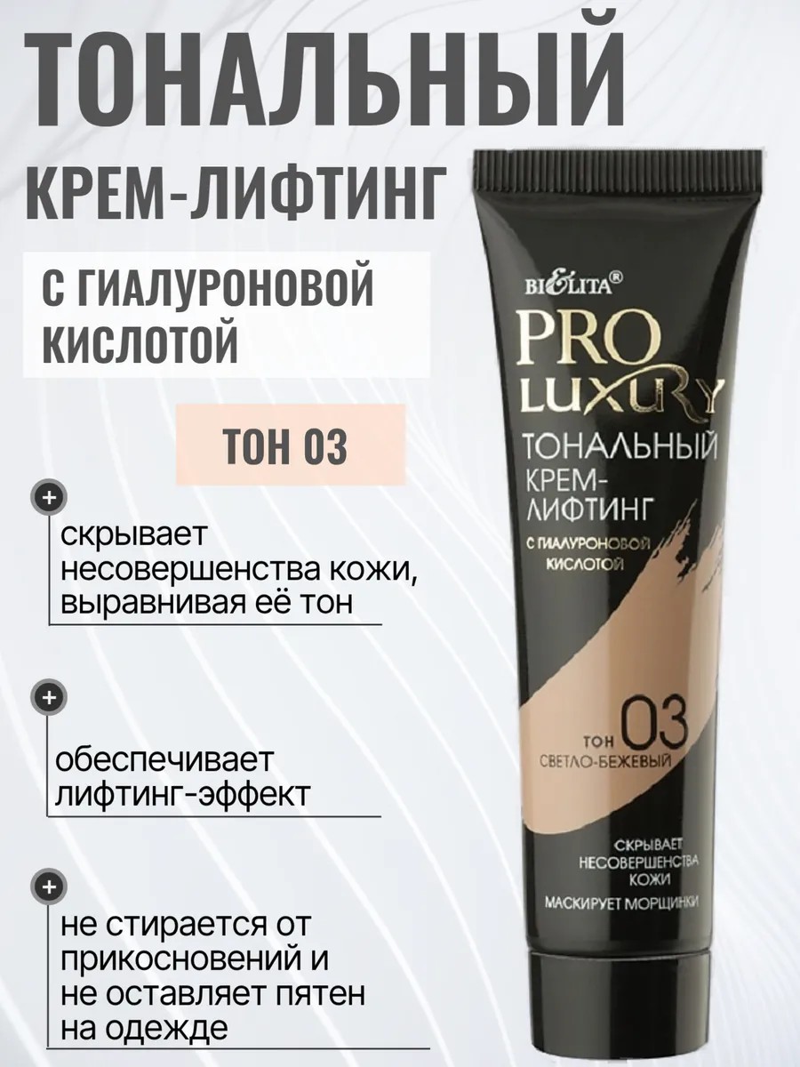 Тональный крем-лифтинг с гиалуроновой кислотой - секрет вашего мгновенного преображения. Крем сочетает в себе 100% натуральные пигменты, подстраивающиеся под естественный тон кожи, и комплекс активных компонентов, которые необходимы для создания идеальной кожи. Комплекс активных компонентов: скрывает несовершенства кожи, выравнивая её тон, безупречно маскирует морщинки, обеспечивает лифтинг-эффект, не создает эффекта маски и не блокирует поры, не стирается от прикосновений и не оставляет пятен на одежде.