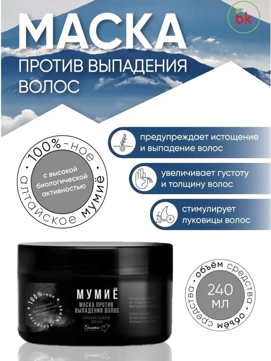 Завершающим этапом интенсивного ухода за волосами, направленного на борьбу с их выпадением, станет косметическая маска от белорусского бренда косметики Белита-М. Она усиливает укрепляющее и стимулирующее действие сыворотки и шампуня из серии «Мумиё», а также предотвращает появление сухости на коже головы и волосах, обеспечивая им необходимое питание, мягкость и блеск.