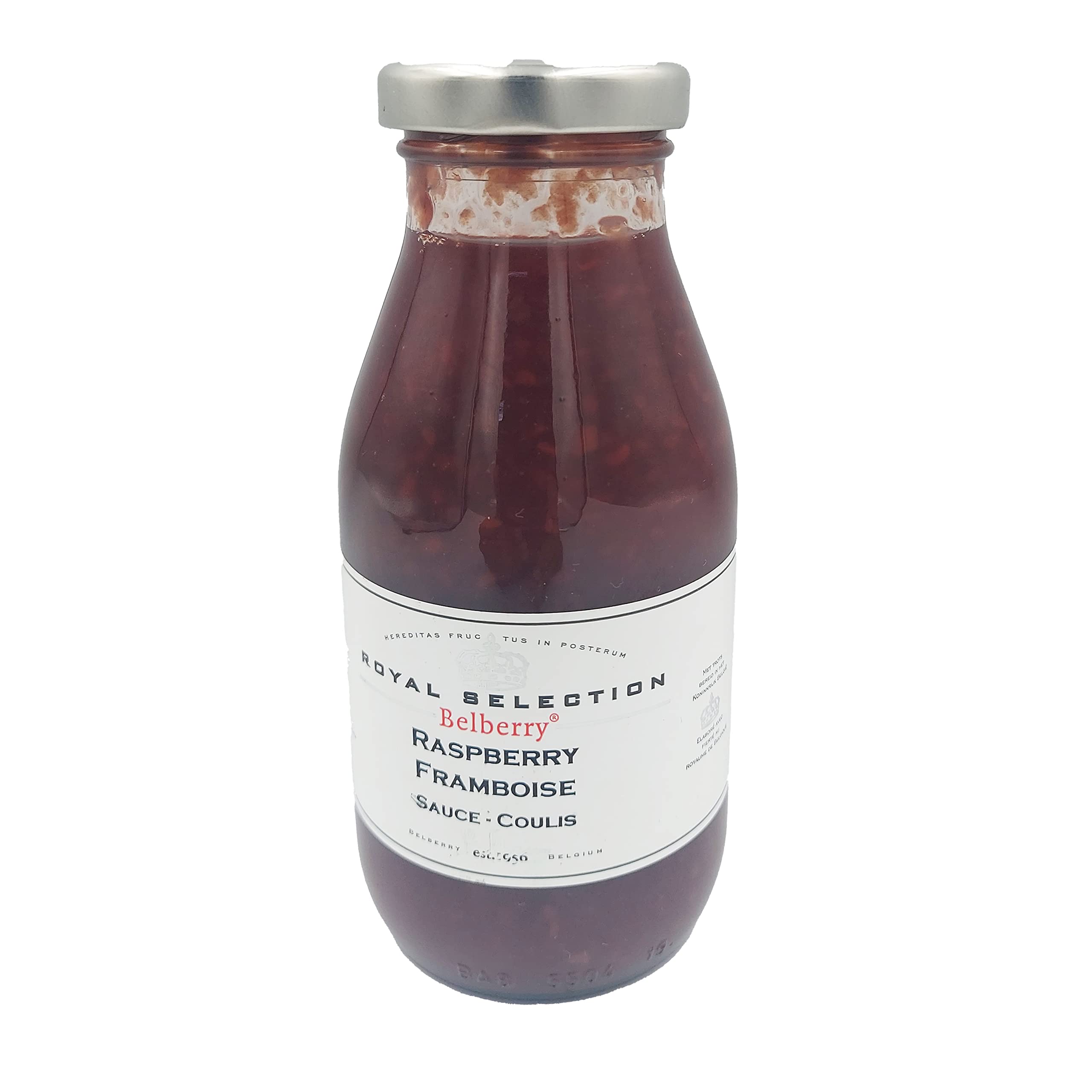 - Raspberry coulis. - Flavor: Raspberry. - Volume: 250 ml. - Ingredients: Fruit puree, sugar, lemon juice, apple pectin. Prepared with fresh fruit. 100 natural.