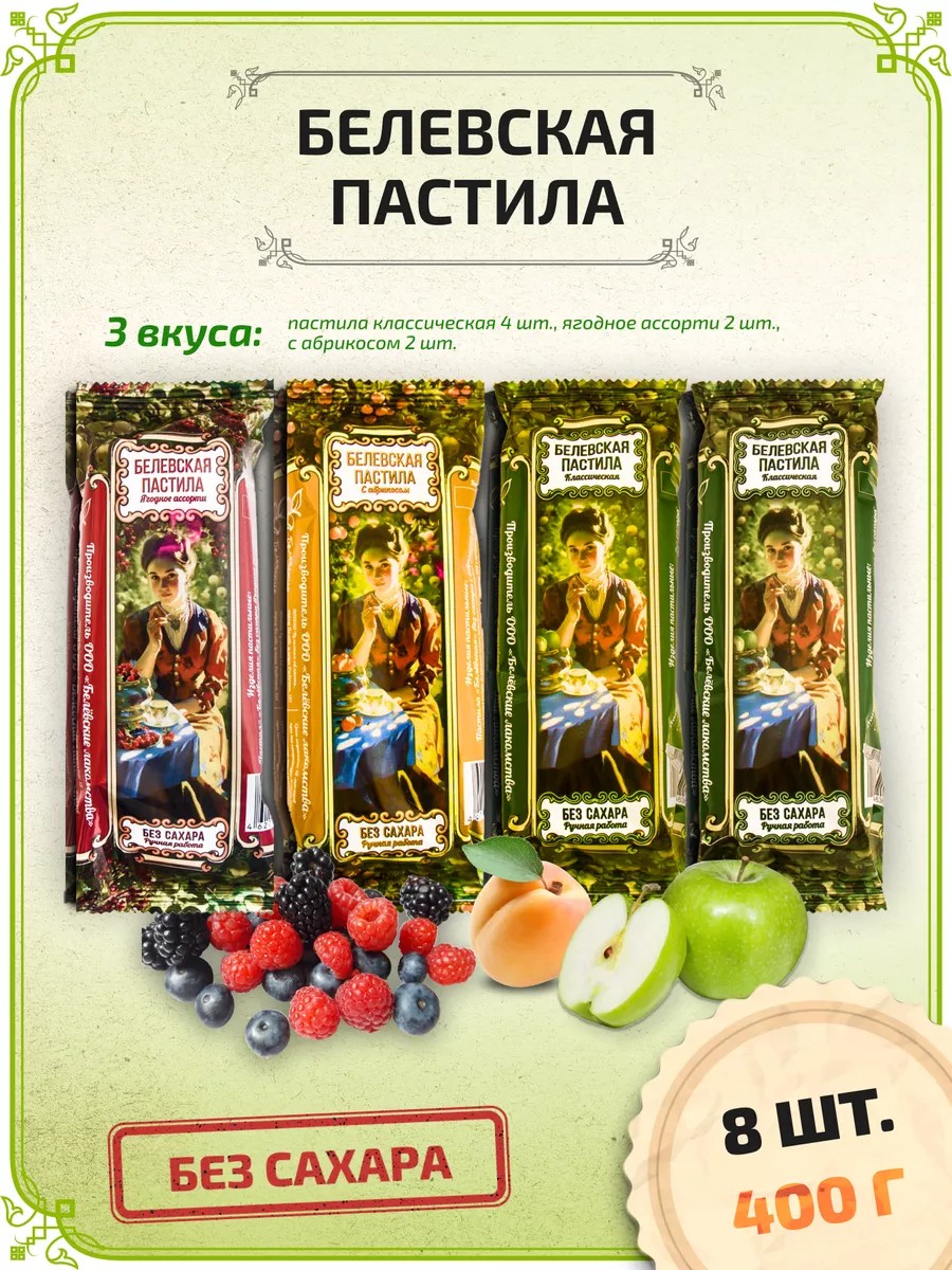 Belevskaya sugar-free pastila in convenient bars! 8 diet bars of 50g each. Each bar contains 75 kcal! It combines low-calorie products with healthy, sugar-free sweets. Natural and gluten-free, it's made with fresh apples. We use select Antonov apples, whose fructose makes our sugar-free pastila as sweet as products containing Russian sugar. This healthy dessert dates back to 1888 and is a truly Russian product. Thanks to our original tradition and strict production quality, our fruit pastila retains all its vitamin and mineral properties, including vitamins C, PP, E, B1, B2, as well as potassium, phosphorus, calcium, magnesium, and iron. This is also facilitated by the dried egg whites included in the formula. We understand the importance of proper nutrition and healthy eating in the modern world, and that's why we offer our Belev products without sugar. If you enjoy unusual treats, dietary desserts, and healthy foods, our pastila will satisfy all your needs. It's perfect for a holiday, as a gift, or simply with tea, complementing or completely replacing your usual cookies and candies. Our selection includes 10 different and unique flavors in two varieties: with and without sugar, so you're sure to find something just right for you.