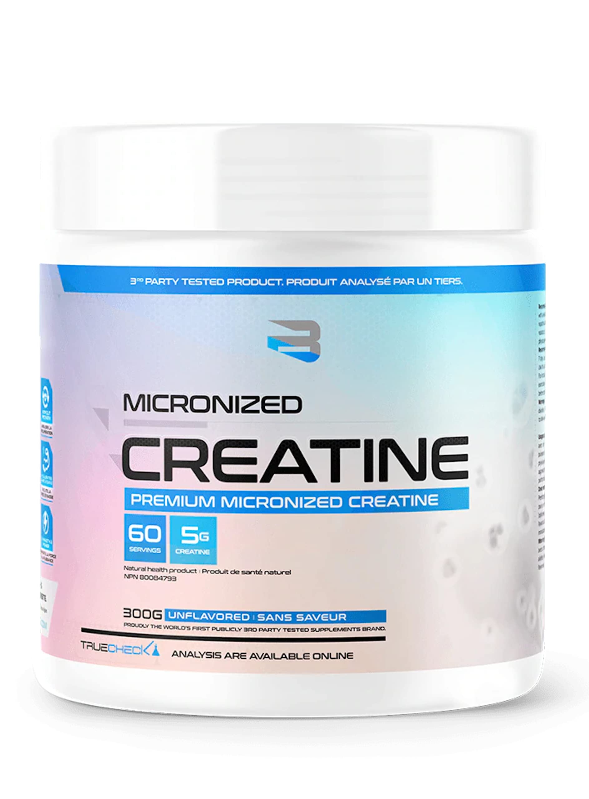 Believe Supplements Micronized Creatine Powder is crafted to fuel muscle growth and promote lean muscle mass, it's the perfect partner for your fitness goals. Experience an unprecedented increase in strength, endurance, and power. Transform your workouts and redefine your limits with Creatine! Micronized Creatine Monohydrate is a form of creatine that has been broken down 20 times further to increase absorption rates and to eliminate any stomach problems. The benefits of this form of creatine are: Improved Solubility, increases the ability to metabolize energy, more servings per dose and finally has all the same benefits as your basic creatine monohydrate. Believe Micronized Creatine Monohydrate Powder is the ideal supplement for people looking to increase their strength, endurance and power. It is easily absorbed and helps promote muscle growth, allowing you to improve your performance and gain more lean muscle mass. Believe Creatine is Vegan friendly, Gluten-Free, Peanut-Free, Lactose-Free, Soy-Free, Sugar-Free, and Dye-Free. Believe Micronized Creatine Monohydrate Powder is unflavoured so that you can easily mix it into your preferred beverage of choice. Each 300 gram container features a total of 60 full servings!Promote Muscle Growth: Believe Creatine features a highly absorbable formula designed to support muscle growth and enhance performance. Believe Creatine features Micronized Creatine Monohydrate which can lead to improved absorption and solubility. Increases Strength: Believe Micronized Creatine Monohydrate is the ideal supplement for people looking to increase their strength, endurance and power. It is easily absorbed and helps promote muscle growth, allowing you to improve your performance and gain more lean muscle mass. Enhanced Performance: Micronized Creatine Monohydrate delivers 100 pure, high-quality creatine to effectively boost your strength, power, and overall athletic performance. With its advanced micronization process, this creatine ensures optimal absorption and faster results, helping you get the most out of every workout and achieve your fitness goals more efficiently. Micronized Creatine Monohydrate: Micronized Creatine Monohydrate is a form of creatine that has been broken down 20 times further to increase absorption rates and to eliminate any stomach problems. The benefits of this form of creatine are improved solubility, increased ability to metabolize energy, more servings per dose and has all the same benefits as your basic creatine monohydrate. Pure Creatine Monohydrate Powder: Believe Micronized Creatine features 5000mg of pure creatine monohydrate in every scoop. Believe Creatine is unflavoured and mixes easily in any drink of your choice or it can be mixed with your beverage of choice.