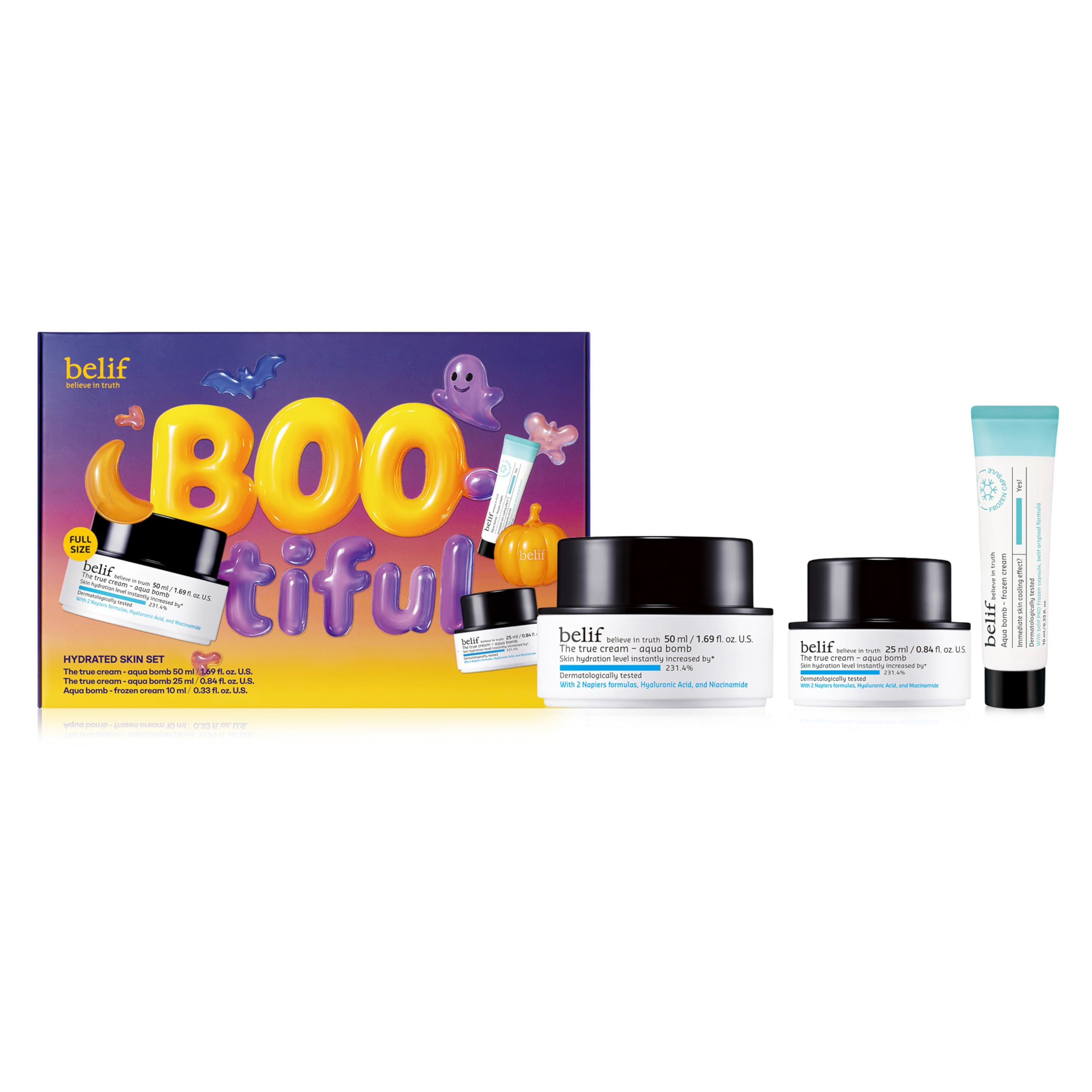 [Frozen Cream] As frozen capsules melt into skin, it cools overheated skin for an immdeiate feeling of relief and refreshment. Clinically tested to reduce puffiness by 30 after just one use. [Aqua Bomb Cream] in just 10 seconds, the lightweight, non-greasy cream instantly makes skin feel plump, smooth, and deeply hydrated without any sticky or greasy residue. Trick or Treatment? - Get ready for frightfully soft and glowing skin with our Boo-tiful Skin Care Set! Packed with belif favorites, aqua bomb frozen cream.
