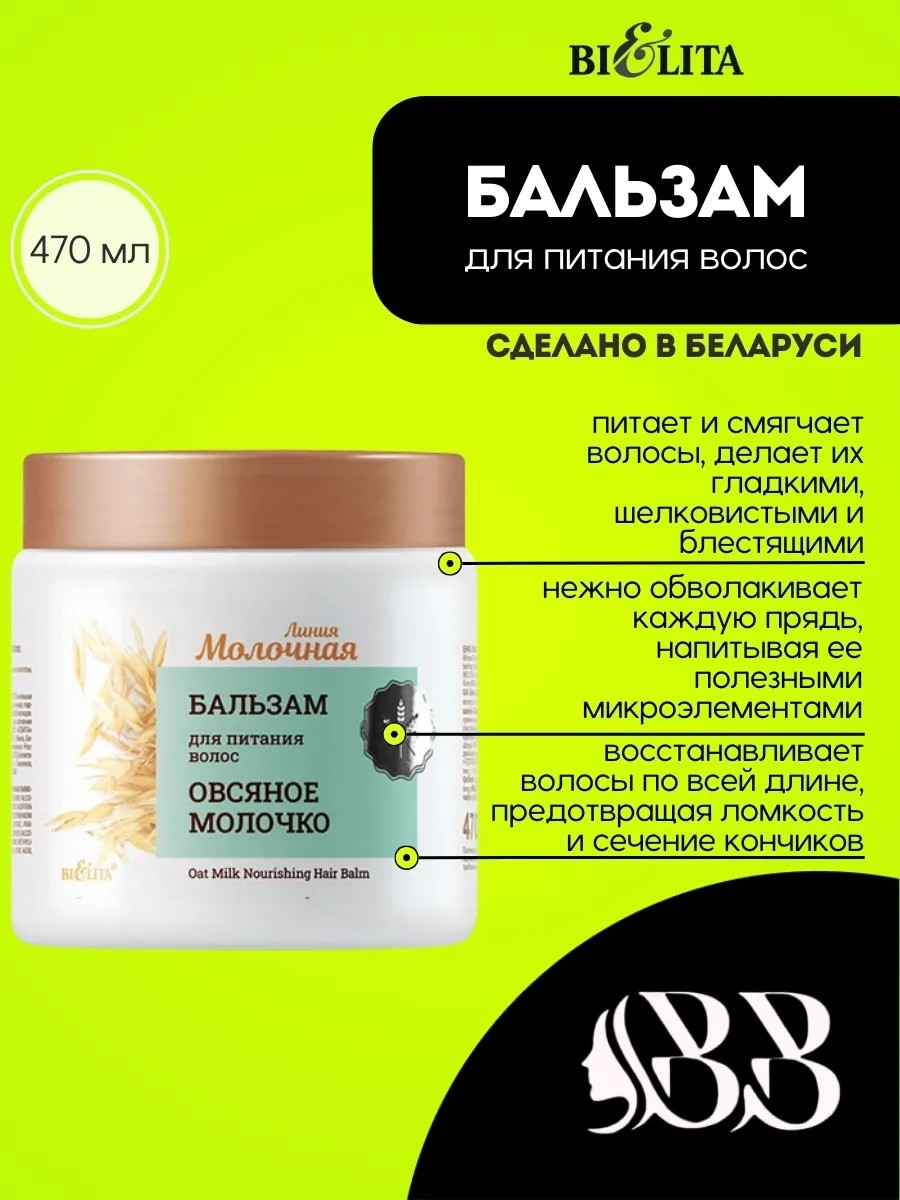 Бальзам для питания волос "Овсяное молочко" Bielita – это ваш незаменимый помощник в уходе за волосами, который подарит им здоровье, блеск и мягкость! Объем 470 мл позволяет наслаждаться эффективным уходом на протяжении долгого времени.