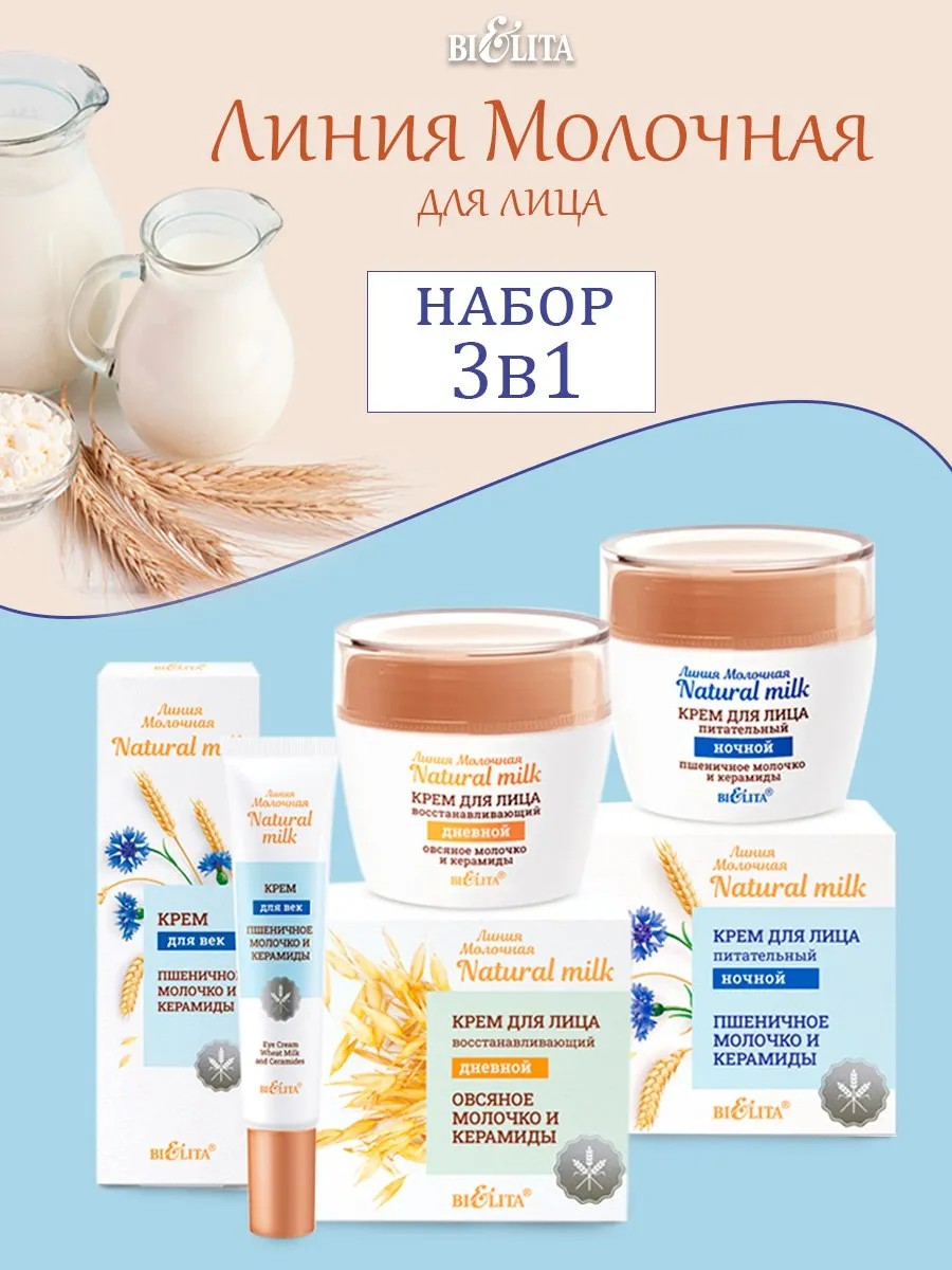 | Комплектация | крем для лица питательный ночной "Пшеничное молочко и керамиды"; крем для лица восстанавливающий дневной "Овсяное молочко и керамиды"; крем для век "Пшеничное молочко и керамиды" |