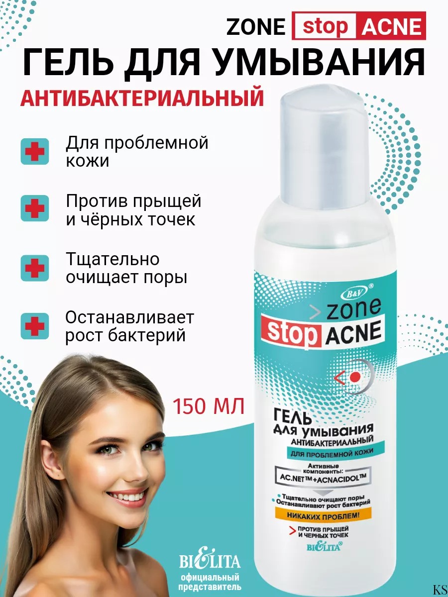 Гель для умывания антибактериальный очищение от белорусского бренда косметики Белита серия Zone Stop Acne против прыщей и черных точек. Глубоко очищает поры, придает коже матовость. Антибактериальные компоненты останавливают рост бактерий, подсушивают, не пересушивая кожу, нормализуют выделение кожного сала.