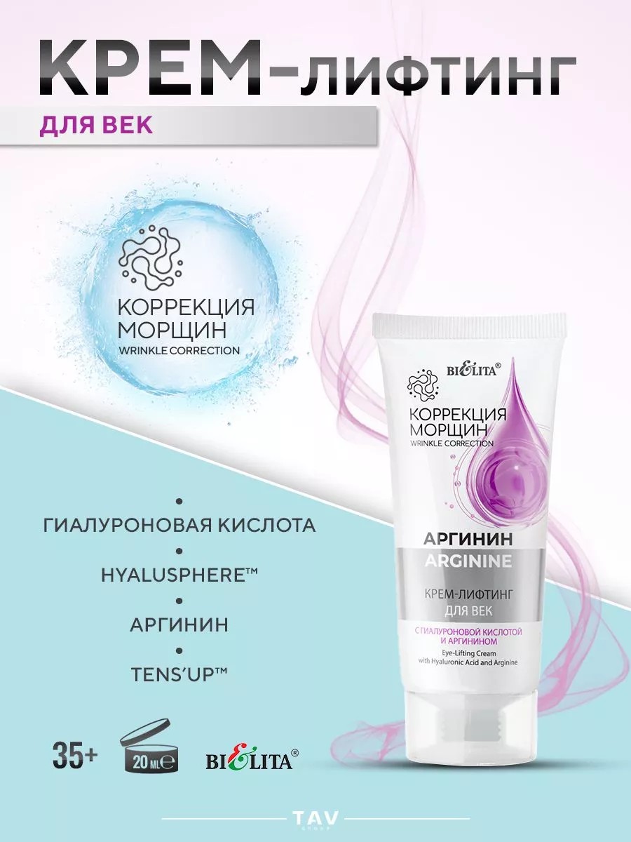 Крем-лифтинг для век с гиалуроновой кислотой и аргининомпредназначен для разглаживания морщин вокруг глаз. Благодаря лифтинг-эффекту кожа становится подтянутой, свежей, упругой. Продукт прекрасно увлажняет и смягчает нежную кожу век, борется с признаками усталости. Подходит для всех типов кожи. Гиалуроновая кислота образует на поверхности эпидермиса тончайшую воздухопроницаемую пленку, запечатывая влагу внутри, повышает упругость и эластичность кожи. Hyalusphereтм – инкапсулированная высокомолекулярная гиалуроновая кислота — проникает в глубокие слои дермы, разглаживает морщины изнутри и выравнивает кожный рельеф. Аргинин стимулирует выработку коллагена, разглаживает морщины, улучшает цвет лица. Tens’Up обеспечивает мгновенный и продолжительный эффект лифтинга, а также разглаживание мелких морщин. Применение: нанесите утром и/или вечером на очищенную кожу век.Назначение: Увлажнение. Смягчение. Лифтинг. В 35-40 лет начинается постепенное провисание кожи лица и шеи, а стрессы и современный ритм жизни усугубляют процесс. Именно из-за разрушения белковых связей овал теряет четкость. Интенсивное антивозрастное воздействие становится возможным благодаря активным компонентам новой линии «Коррекция морщин. Аргинин». Аргинин – незаменимая аминокислота, которая устраняет несовершенства кожи, укрепляет тургор и повышает тонус эпидермиса, стимулирует обновление и омоложение кожи, уменьшает гиперпигментацию и обеспечивает лифтинг-эффект.