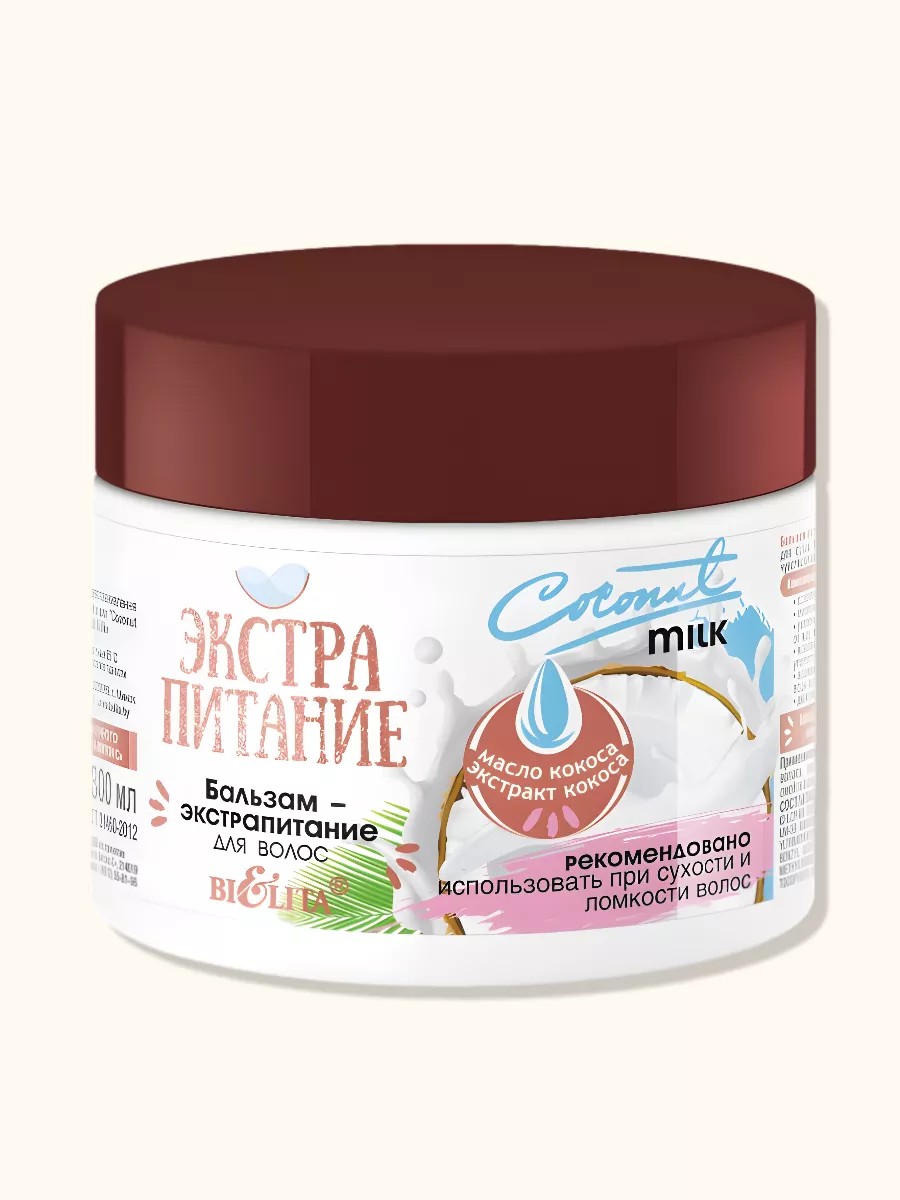 интенсивно питает и эффективно увлажняет сухие волосы; успокаивает кожный покров, избавляя нежную кожу головы от зуда, шелушения и излишней сухости; восстанавливает поврежденные волосы, придавая им силу и упругость; защищает ваши локоны от негативного влияния соленой воды, ветра, мороза и ослабляет воздействие УФ-излучения; дарит волосам роскошный блеск и пленительную красоту. Кокосовое масло – настоящее гурманское лакомство для волос – заполняет пустоты на поврежденных участках волос, глубоко проникает в их структуру, насыщает питательными и увлажняющими компонентами, способствует восстановлению волос, возвращая им мягкость, гладкость и здоровый блеск. Экстракт кокоса обогащает волосы витаминами, протеинами и аминокислотами, укрепляет волосяные луковицы, образует на поверхности волоса защитный слой и оберегает их во время мытья, сушки феном, расчесывании и других процедур. Применение: нанесите бальзам-экстрапитание на влажные вымытые волосы, распределите по всей длине, подождите 2-3 минуты, смойте водой. Сделано в Беларуси.