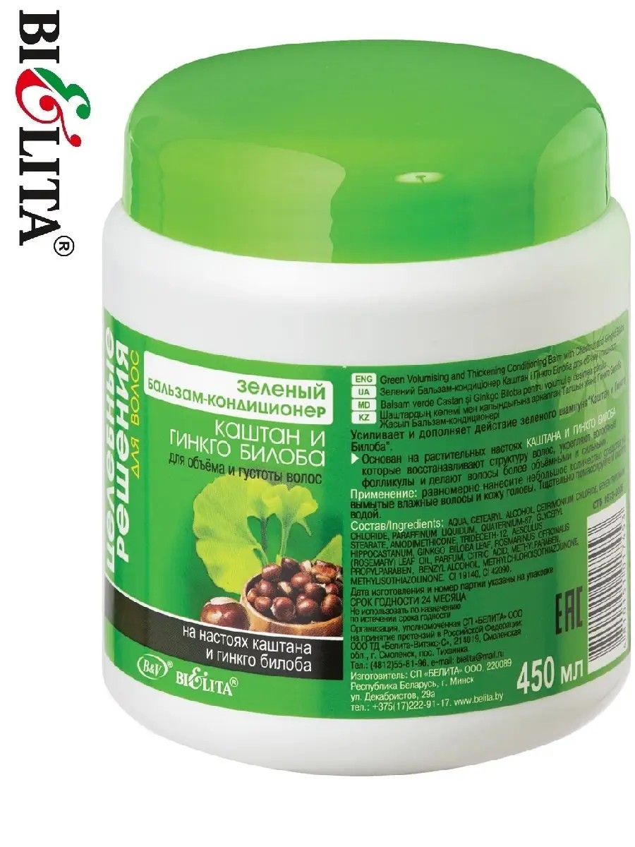Chestnut and Ginkgo Biloba Conditioner for Hair Volume and Thickness. Belita's Healing Solution. Thin and weak hair is fragile and vulnerable; it is very delicate, brittle, and easily tangled. Due to a lack of nutrition, it weakens, is prone to hair loss, and its ability to retain water decreases. It needs to be nourished from the inside and outside, strengthening the hair follicles. Green Chestnut and Ginkgo Biloba Conditioner for Hair Volume and Thickness provides excellent care for thin and weak hair. Based on herbal infusions of chestnut and ginkgo biloba, which restore hair structure and make it more voluminous and strong. Chestnut strengthens hair follicles, improves growth, and promotes volume and thickness. Ginkgo Biloba stimulates and restores the scalp's essential vital functions, nourishes and strengthens the hair.