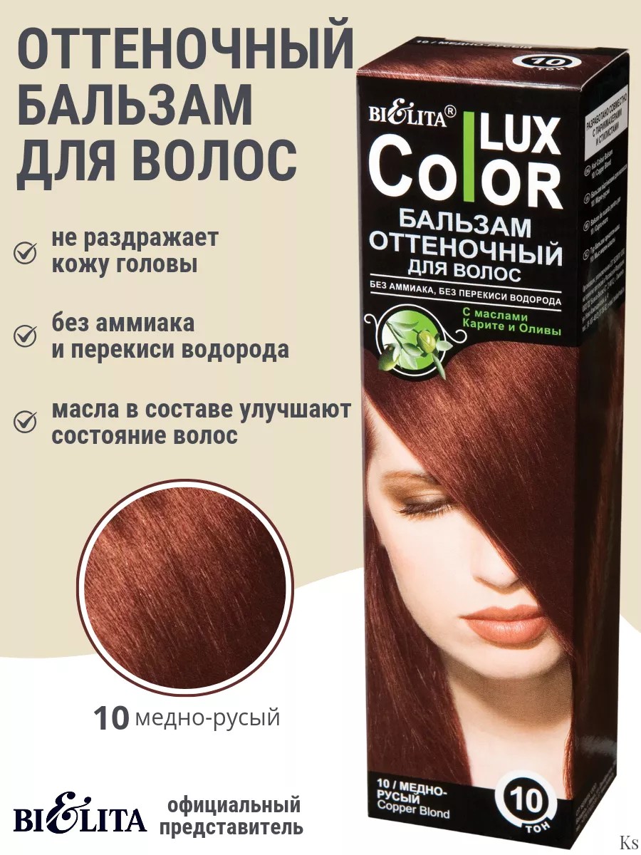 Оттеночные бальзамы для тонирования волос COLOR LUX от белорусского бренда косметики Белита бережное и эффективное средство достижения модного цвета волос: красящие пигменты не повреждают структуру волос, хорошо удерживаются чешуйками кутикулы поверхностного слоя волос, натуральные масла выравнивают структуру волос. Яркость сияния цвета волос достигается уже после однократной процедуры окрашивания волос.