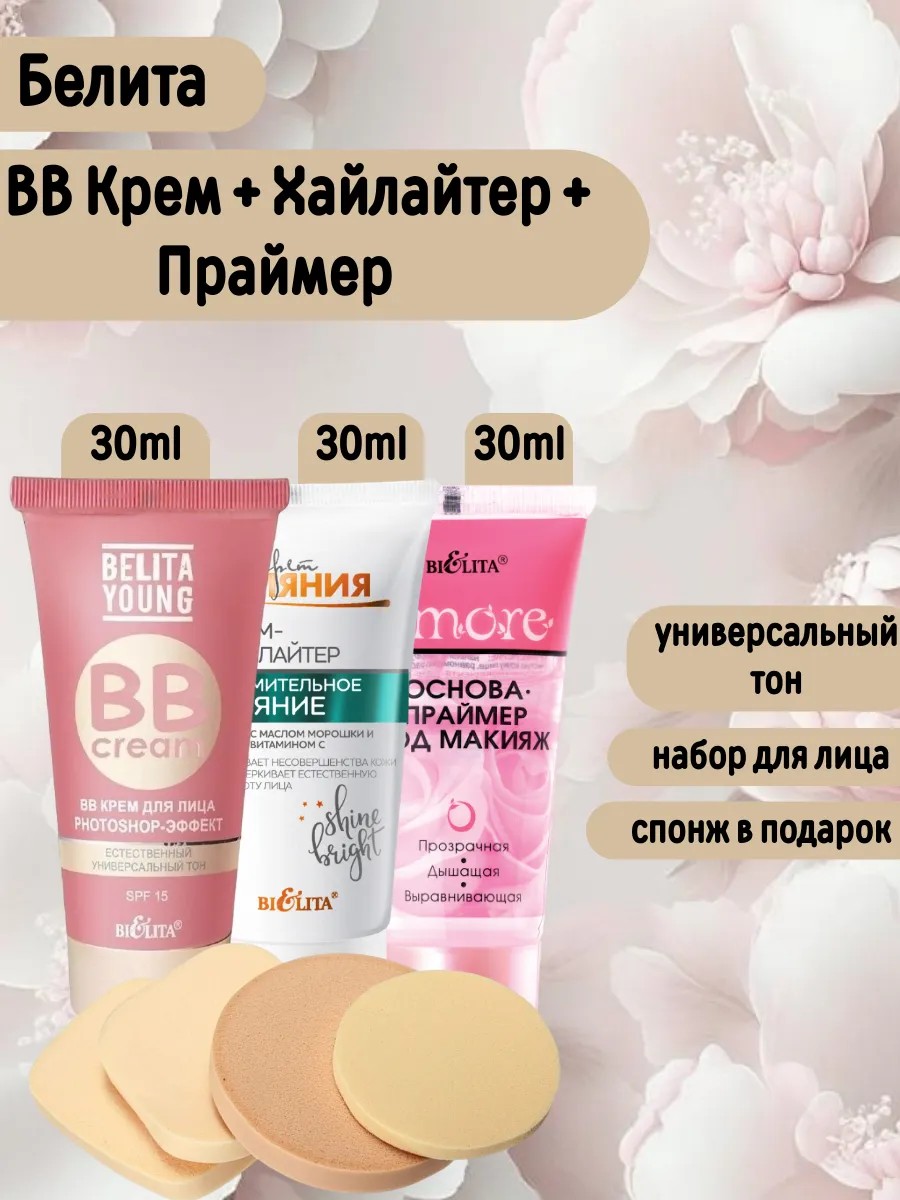 ВВ-крем Belita Young и Amore-праймер и Секрет сияния Крем-хайлайтер и спонж косметический.