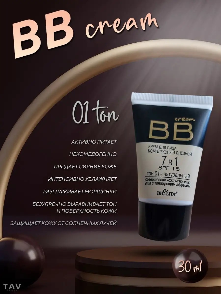 BB-крем - современный многофункциональный крем, сочетающий в себе совершенный уход: безупречно выравнивает тон и поверхность кожи; интенсивно увлажняет; активно питает; разглаживает морщинки; придает сияние коже; защищает кожу от солнечных лучей; некомедогенно. Назначение: Увлажнение, Питание, УФ-защита, Защита от солнца. Применение: нанесите BB-крем на чистую кожу лица, шеи, декольте; равномерно распределите.