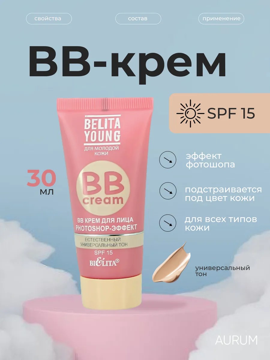 BB крем для лица Young Photoshop-эффект SPF15 из коллекции белорусского бренда Белита адресован молодой коже. Средство универсального оттенка легко наносится, моментально подстраивается под природный тон кожи, совершенствует и освежает его, скрывает имеющиеся недостатки, а также активно ухаживает за лицом.