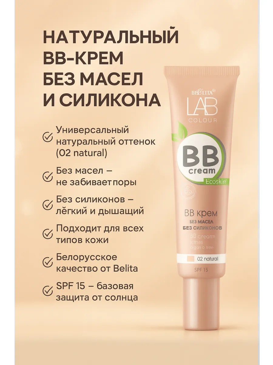 BB крем без масел и силиконов LAB colour, natural от БЕЛИТА — это идеальный выбор для тех, кто ценит естественность и заботу о коже. Этот легкий крем с SPF 15+ выравнивает тон лица, скрывает несовершенства и придает коже сияние, при этом не забивая поры. Формула без масел и силиконов подходит даже для чувствительной кожи, а натуральные компоненты, такие как экстракт якона и олигосахарид альфа-глюкана, оказывают успокаивающее и увлажняющее действие. LAB colour, natural — ваш верный помощник в создании безупречного макияжа на каждый день.