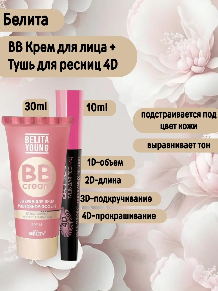 ВВ Крем для лица Belita Young и Тушь 4D МЕГА ЭФФЕКТ накладных ресниц Amore.