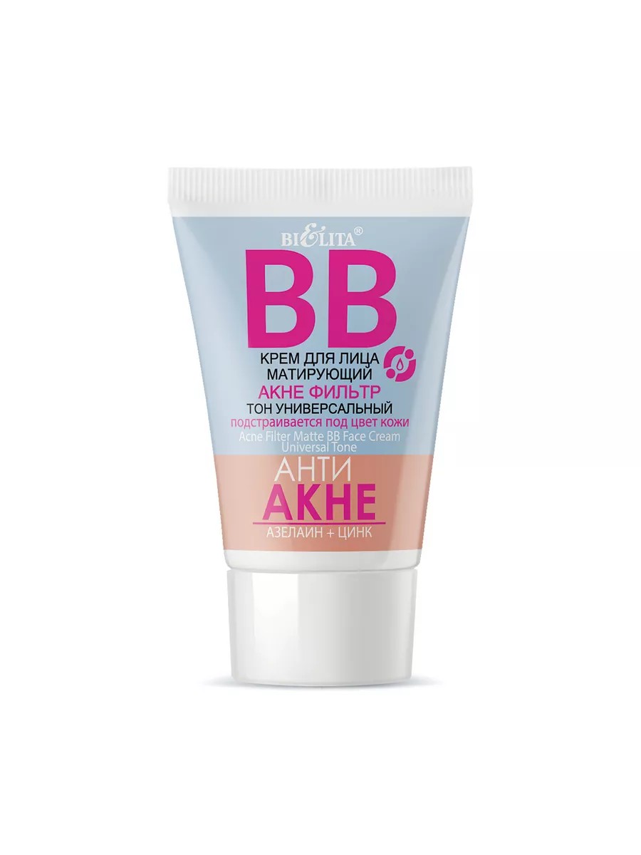 BB крем для лица матирующий "Акне фильтр", тон универсальный, 30 мл - не только обеспечивает исключительное покрытие, но и действует как ухаживающее средство. BB-крем сохраняет свежесть и бархатистость с утра до вечера. Он обогащен компонентами, которые помогают справиться с проблемой акне. Азелаиновая кислота, мощный компонент, борющийся с акне, предотвращает появление черных точек, неустанно работая над тем, чтобы не допустить появления высыпаний. Цинк контролирует избыточное выделение жира, что делает его идеальным выбором для тех, кто склонен к жирной коже. BB-крем легко адаптируется к различным оттенкам кожи, обеспечивая естественное и ровное покрытие для всех. Раскройте секрет матовой кожи с помощью нашего нового BB-крема - ведь вы заслуживаете только самого лучшего для своей кожи. ВВ крем имеет усовершенствованную матирующую формулу, подстраивается под цвет кожи,