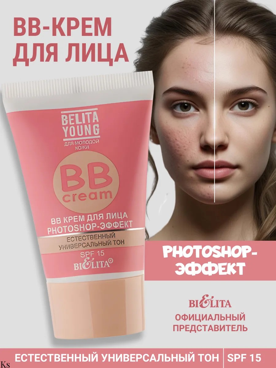 Belita's universal, natural Photoshop-effect BB cream adapts to any skin tone, instantly evens out skin tone, moisturizes, and visually conceals imperfections. It offers SPF 15 protection. It creates a weightless, matte finish without the mask effect. This airy foundation conceals enlarged pores, uneven skin texture, and pigmentation. Botanical extracts and skincare ingredients provide intense hydration. This matte face cream forms a thin layer, keeping makeup looking clean and fresh all day long. Australian berry extract infuses skin with vitamins and minerals. This BB foundation is suitable for all skin types, including dry, oily, and problematic skin. It can also be used under the eyes. Photoshop BB cream is the best-selling BB cream. It perfectly fulfills the three basic functions of BB products (beauty balm) – perfect makeup, innovative skincare, and sun protection. Ideal for young skin, this BB cream rivals Korean cosmetics. This BB cream is a great gift for women who want to look perfect in any situation. Whether it's a party, a date, or just everyday wear, this cream will help you create the perfect makeup and highlight your natural beauty. Apply Belita BB cream to cleansed face and neck. Gently massage in. For a matte finish, apply powder. Its camouflaging texture makes it ideal for under-eye concealer. Belarusian cosmetics foundation is a great gift for girls for New Year's, March 8th, Valentine's Day, and birthdays. It makes a wonderful addition to a beauty box for any occasion. BELITA YOUNG Photoshop BB Cream is the perfect coverage for your skin: healthy color, freshness, and radiance all day long! The manufacturer has rebranded the BB cream for the Photoshop Effect Young brand, and it is now sold in a new design and without the protective foil inside the tube.