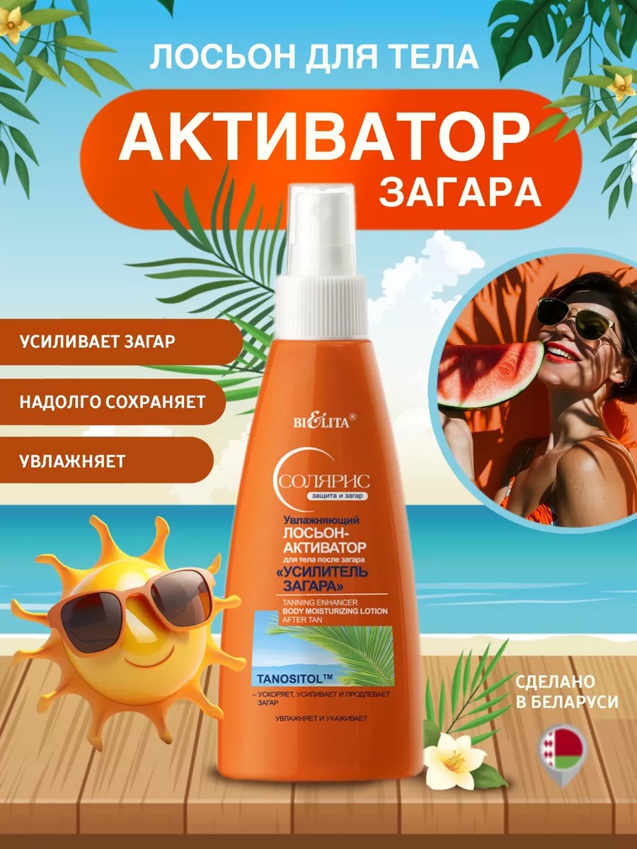 Увлажняющий лосьон - активатор для тела после загара «Усилитель загара» 150 мл Белита. крем усилитель загара на солнце для тела великолепно впитывается, придает ощущение комфорта и свежести, помогает надолго сохранить загар и сияние кожи. Спрей для тела солнцезащитный ускоряет, усиливает и продлевает загар. Средство после загара оказывает мощное увлажняющее действие. Спрей - крем с экстрактом зеленого чая оказывает антиоксидантное действие. Для красивого загара что только не используют: от автозагара до кремов с бронзатором. Но скоро лето в это время очень важна защита от солнца для лица, тела, а также рук и ног. Увлажняющий спрей для тела регенерирующий активатор загара, который борется против ожогов, образования пятен и сухости. Проявитель загара оказывает глубокое увлажнение, делает кожу мягкой и эластичной, при этом не вызывая раздражения. Интенсивный увлажняющий ускоритель загара подарит идеальный оттенок коже и придаст эффект сияния. Рекомендуется применять средство непосредственно после загара и солнца. Белита Витэкс - косметика из Беларуси.