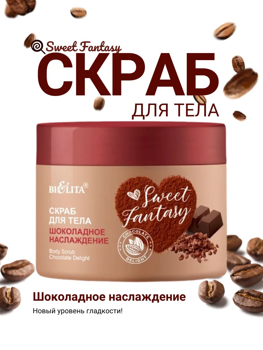 Chocolate Delight Body Scrub by SWEET FANTASY. Give your skin a new level of smoothness with the Chocolate Delight Body Scrub. Cocoa and coconut oils deeply nourish and soften the skin, eliminating dryness and flaking. Green coffee extract tones and firms the skin, while caffeine promotes lymphatic drainage and restores elasticity. Natural ground coffee and cocoa powder activate subcutaneous metabolism, promote the elimination of toxins, and even out skin texture.