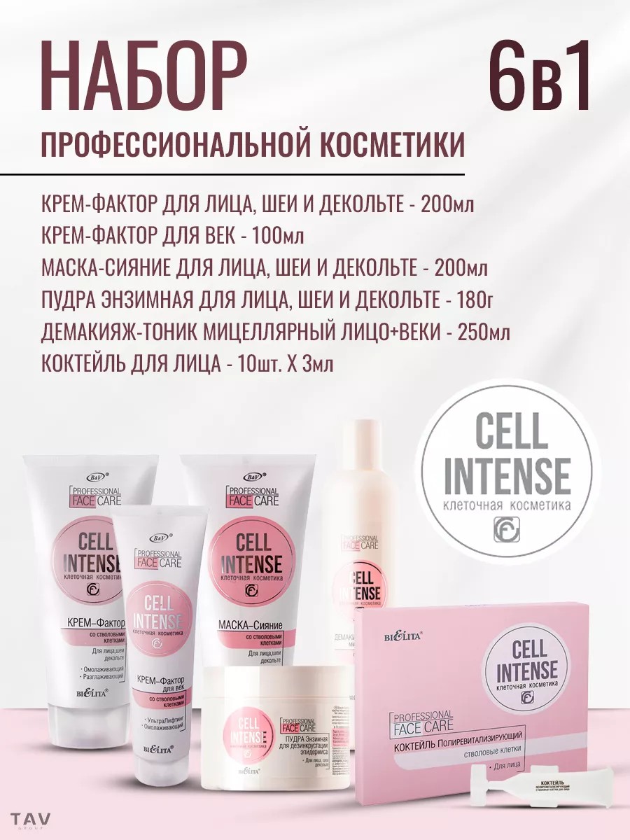 Профессиональный полноценный набор для ухода за лицом, шеей, декольте и век Cell Intense — линия профессиональных цитокосмецевтических препаратов, основанных на сочетании геропротекторного действия биодоступных растительных "стволовых клеток" Citrustem и пептида — фактора самообновления эпидермальных стволовых клеток Survixyl. Теоретически, стволовые клетки кожи человека способны к регенерации на протяжении свей жизни, тем не менее, с возрастом активность этих клеток угасает. В это время наша кожа нуждается в дополнительной стимуляции и защите. Набор состоит: пудра Энзимная для дезинкрустации эпидермиса для лица, шеи, декольте. Предназначена для проведения мягкой механической дермабразии в сочетании с эффективным энзимным пилингом за счет натуральных ферментов ананаса, которые эффективно отшелушивают мертвые клетки, придают гладкость коже, идеально подготавливая ее к проведению дальнейших процедур. демакияж-тоник на мицеллярной структуре — очищающее средство нового поколения. Мицеллы — особые частицы, которые притягивают загрязнения как магнит. Демакияж быстро удаляет тушь и другую декоративную косметику, не оставляя следов. Крем-Фактор со стволовыми клетками для лица, шеи, декольте. Омолаживающий Разглаживающий, Мультиактивный антивозрастной крем 24-часового действия. Обогащен растительными стволовыми клетками и пептидами, которые стимулируют естественные процессы клеточного обновления. Крем-Фактор для век со стволовыми клетками. УльтраЛифтинг - Омолаживающий. Эффективный крем для омолаживающего ухода за тонкой деликатной областью вокруг глаз. коктейль стволовые клетки для лица, для эффективного омолаживающего ухода. Содержит высокую концентрацию растительных стволовых клеток, которые действуют на клеточном и молекулярном уровнях, стимулируя естественные процессы обновления кожи. Маска для лица, шеи и декольте. Обновляющая. Разглаживающая. Возраст 35+, 40+, 45+, 50+, 55+, 60+