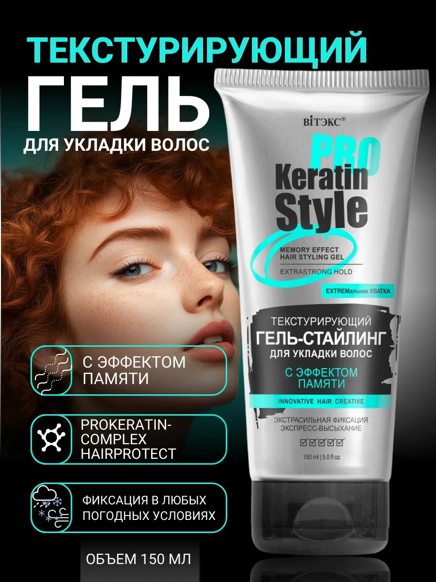 Dive into a world of stylish looks with KERATIN PRO Style hair styling gel! This texturizing gel with a memory effect from VITEX will be your reliable assistant in creating the perfect hairstyle. Thanks to its innovative formula with a memory effect, your style will be unaffected by wind and rain. PROKeratin-complex HairProtect provides your hair with the necessary care, making it strong and elastic. Express your individuality by highlighting bright accents and emphasizing the texture of your hair with this gel. Don't miss the opportunity to easily restore your style at any time - simply apply the gel to your hair and enjoy long-lasting results. KERATIN PRO Style professional hair styling product is the ideal fixative for creating beautiful, bouncy curls. This gel provides strong hold, making it an excellent choice for both men's and women's hairstyles. Thanks to its complex of active ingredients, it not only fixes but also strengthens hair, making it healthier and stronger. It's ideal for styling curly and wavy hair, helping to create beautiful, long-lasting curls. With KERATIN PRO Style, your curls will look natural and beautiful, and your style will last all day. This product will be an indispensable assistant for those who want to maximize their curls and highlight their natural beauty. KERATIN PRO Style is a professional keratin hair gel that provides strong hold and is ideal for styling curly hair. This styling gel provides unrivaled hold while also strengthening and restoring hair, making it healthier and stronger. Thanks to its keratin formula, it provides hair with the necessary care and protection, making it more beautiful and well-groomed. This product from a Belarusian hair cosmetics manufacturer provides unrivaled hold and is ideal for creating beautiful, long-lasting hairstyles.