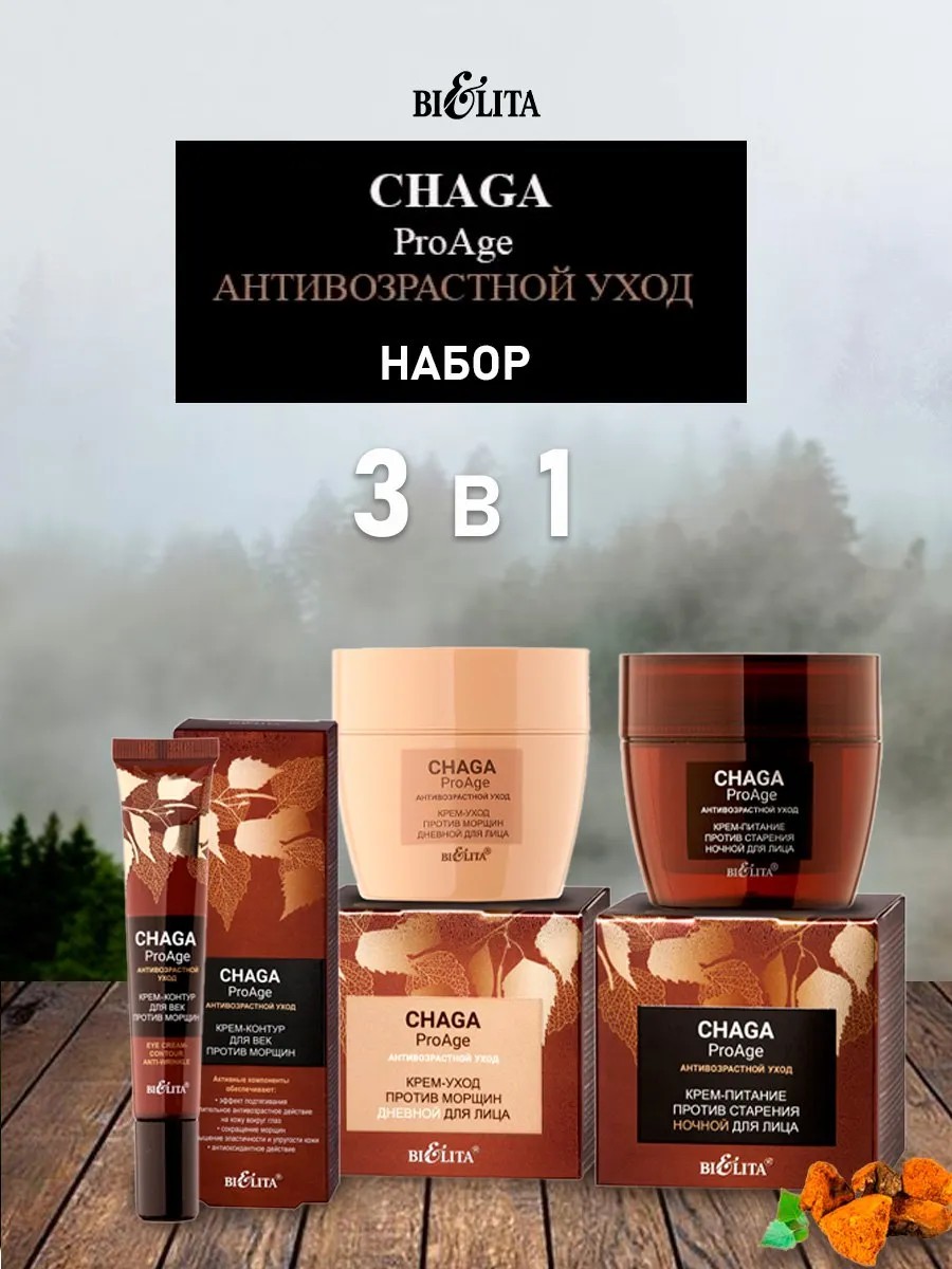 | Комплектация | крем-питание против старения ночной для лица ЧАГА; крем-уход против морщин дневной для лица ЧАГА; крем-контур для век против морщин ЧАГА |