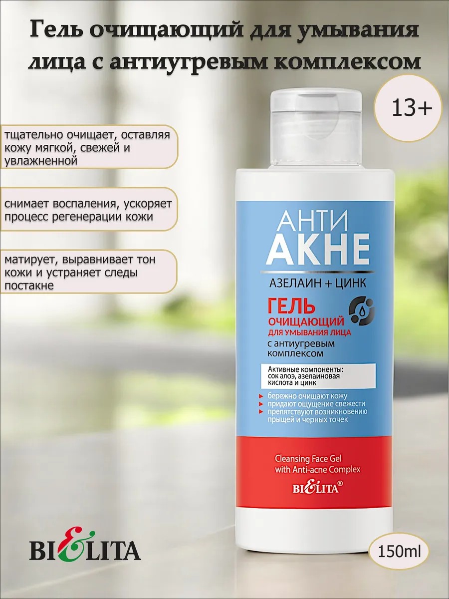 | Полное наименование товара | Гель очищающий для умывания лица с антиугревым комплексом 150мл. Линия Анти Акне. Азелаин+Цинк. Belita |