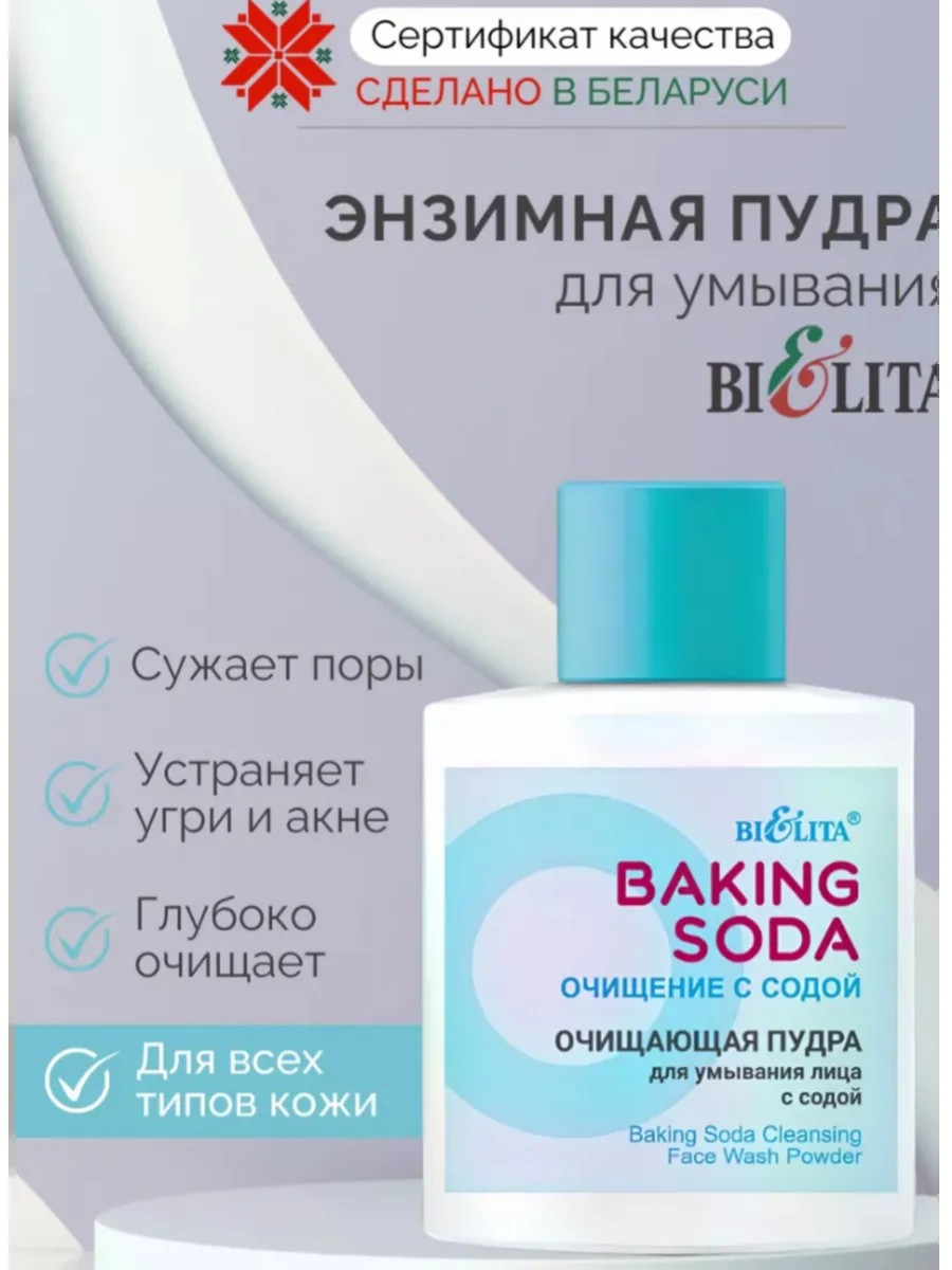 BELITA Baking Soda Cleansing Powder is a gentle and effective daily skin care product. Its unique formula, enriched with natural baking soda, gently removes impurities, excess sebum, and makeup without over-drying the skin. The powder easily transforms into a soft foam upon contact with water, delicately cleansing pores and leaving a feeling of freshness and cleanliness. Regular use of this baking soda cleansing powder helps even out skin tone, reduce inflammation, and impart a healthy glow. Suitable for all skin types, including sensitive skin.