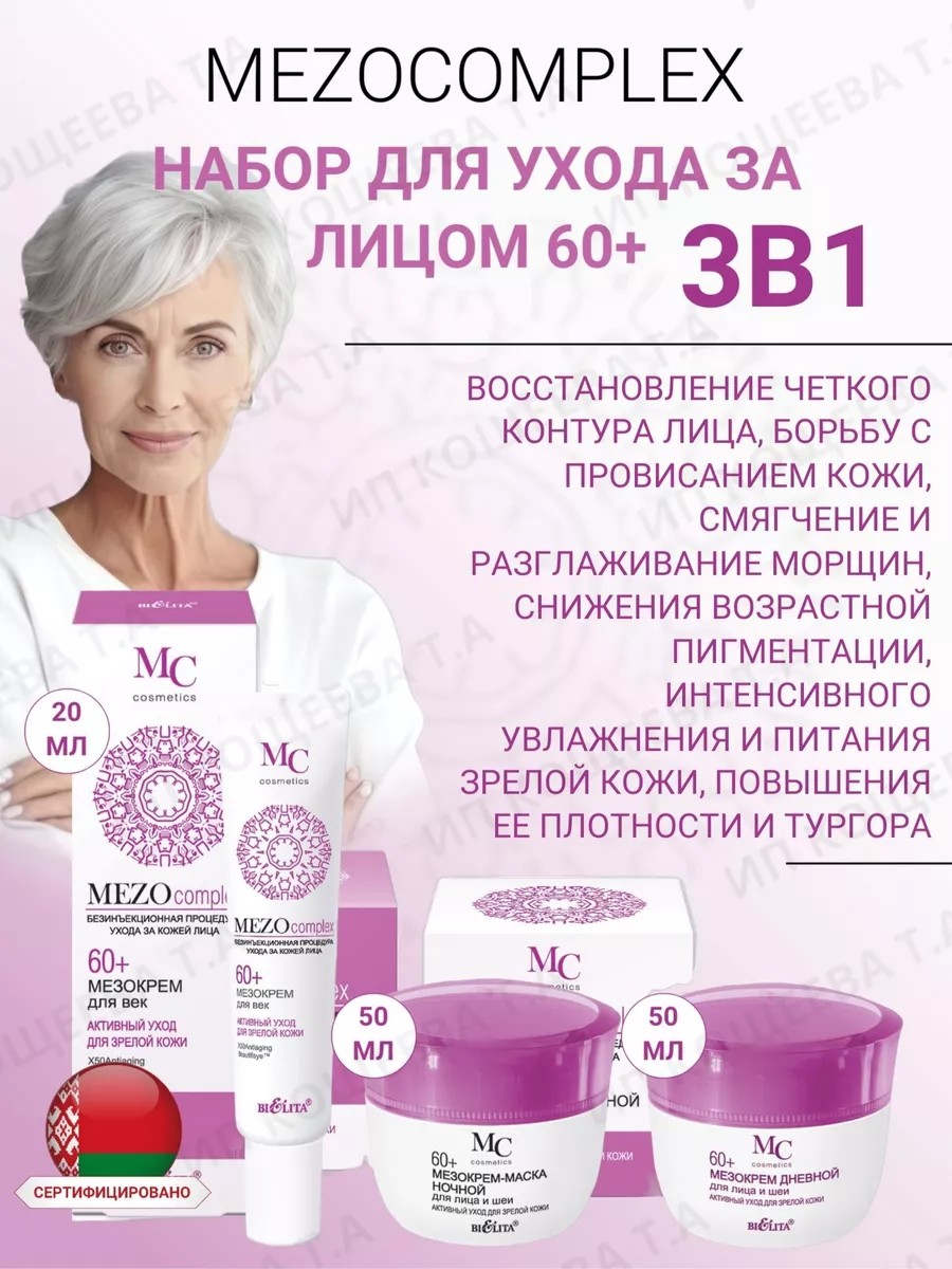 Косметика Mezocomplex 60+Набор косметики для ухода за кожей лица MEZOcomplex 60+ (крем дневной + крем маска ночной + крем для век) БЕЛИТА. МЕЗО крем дневной для лица и шеи 60+ Активный уход для зрелой кожи. Насыщенный дневной мезо крем специально разработан для ухода за зрелой кожей лица в возрасте старше 60 лет. Специально подобранные высокоэффективные компоненты, которые оказывают комплексное действие на кожу лица: смягчают и сокращают морщины, глубоко питают и увлажняют, снижают возрастную пигментацию, восстанавливают природную способность кожи к выработке коллагена и эластина, возвращают упругость и эластичность кожи, интенсивно подтягивают и борются с провисанием коживосстанавливают четкий контур лица. Гиалуроновая кислота направленного действия проникает в глубокие слои эпидермиса, обеспечивает видимый эффект разглаживания морщин путем выталкивания их изнутри, оказывает действие подобное салонной процедуре мезотерапии. МЕЗО крем-маска ночной для лица и шеи 60+ Активный уход для зрелой кожи. Роскошный ночной мезокрем-маска с высокими питательными, увлажняющими и смягчающими свойствами обеспечивает насыщенный уход за зрелой кожей лица, шеи и зоны декольте в ночное время. Специально подобранные высокоэффективные компоненты: стимулируют синтез коллагена и эластина, борются с провисанием кожи, интенсивно ее подтягивают, повышают упругость и эластичность, восстанавливают овал лица, снижают возрастную пигментацию, насыщают клетки кожи влагой, возвращают лицу здоровый сияющий вид. Гиалуроновая кислота глубоко увлажняет кожу и удерживает влагу на поверхности, разглаживает морщины, повышает эластичность кожи и выравнивает ее тон. МЕЗОкрем для век 60+ Активный уход для зрелой кожи. Мезокрем для век разработан с учетом особенностей возрастной кожи. Имеет направленное действие: ПОДТЯГИВАЕТ ВЕРХНЕЕ ВЕКО, СОКРАЩАЕТ МОРЩИНЫ «ГУСИНЫЕ ЛАПКИ», УМЕНЬШАЕТ ПРИПУХЛОСТИ И ТЕМНЫЕ КРУГИ.