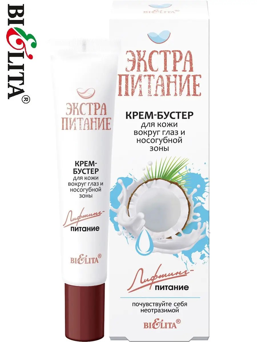 Крем-бустер для кожи вокруг глаз и носогубной зоны ЭКСТРАПИТАНИЕ БелитаКрем-бустер для кожи вокруг глаз и носогубной зоны Лифтинг-питание - интенсивное средство по уходу за кожей вокруг глаз и носогубной зоной, которое совмещает в себе ультрапитательный крем и высококонцентрированную омолаживающую сыворотку, оказывая мгновенный и эффективный результат.Комплекс активных компонентов воздействует на кожу вокруг глаз и носогубную зону.вокруг глаз:-глубоко питает и смягчает кожу-уменьшает припухлости и темные круги-мгновенно разглаживает морщинки и подтягивает нежную кожу век-снимает признаки усталости и напряжения, придавая взгляду чувственность и притягательностьвокруг носогубной зоны:-наполняет питательными веществами кожу вокруг губ-наполняет морщинки носогубной зоны-защищает от сухости и шелушения нежную кожу в области вокруг губ-укрепляет контур губ .