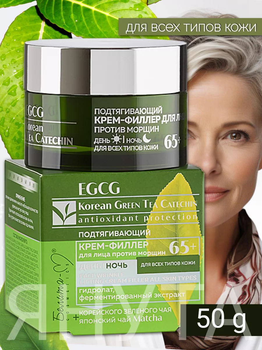 Подтягивающий крем-филлер против морщин для лица день/ночь 65+ для всех типов кожи EGCG KOREAN GREEN TEA CATECHIN 50 г . Роскошный крем содержит комплекс активных антивозрастных компонентов для сбалансированного ежедневного ухода за зрелой кожей. Интенсивно наполняет клетки влагой и необходимыми элементами, возвращает коже жизненную силу и стирает признаки увядания. Выравнивает тон и рельеф кожи, подтягивает овал лица. Возвращает коже естественную красоту и наполняет ее внутренним сиянием.