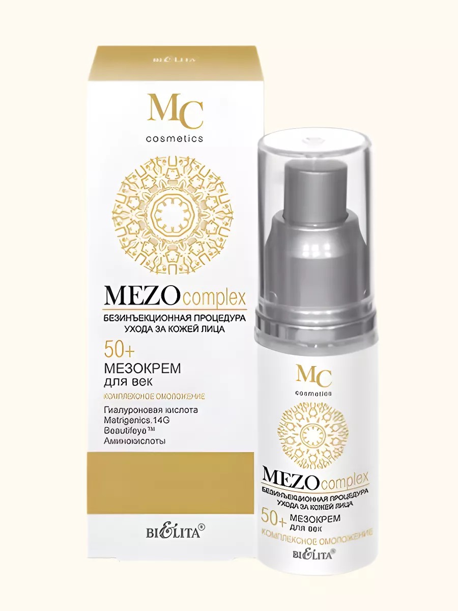 Мезокрем для век восстанавливает оптимальный уровень увлажненности кожи век, усиливает микроциркуляцию, уменьшает припухлости и темные круги под глазами, подтягивает кожу век и разглаживает морщины вокруг глаз. Matrigenics.14G активирует 14 генов, участвующих в синтезе коллагена, эластина и гиалуроновой кислоты, уменьшает морщины через 14 дней ежедневного применения. Beautifey подтягивает кожу век, разглаживает морщины вокруг глаз, уменьшает припухлости и темные круги под глазами. Гиалуроновая кислота направленного действия проникает в глубокие слои эпидермиса, обеспечивает видимый эффект разглаживания морщин путем выталкивания их изнутри, оказывая действие подобное салонной процедуре мезотерапии.