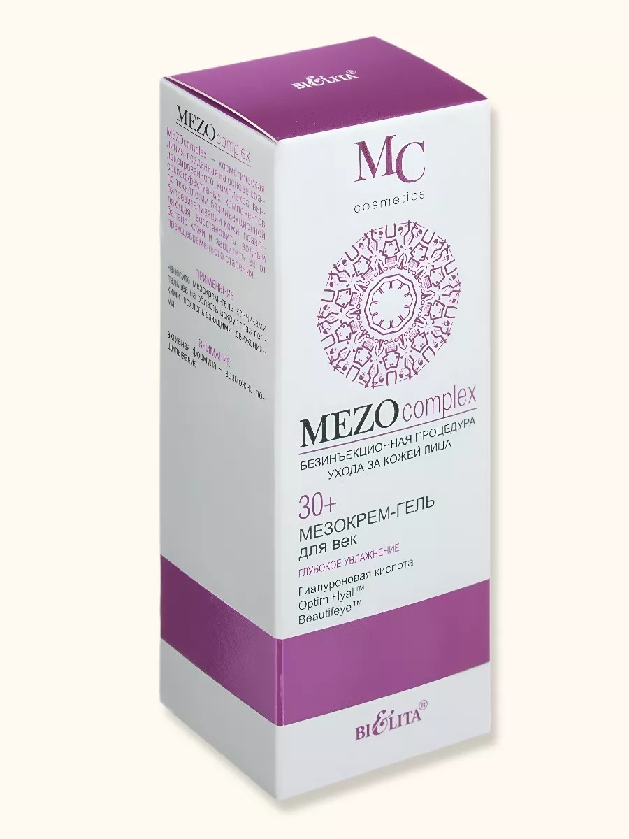 Легкий мезокрем-гель для век восстанавливает оптимальный уровень увлажненности кожи век, разглаживает морщины вокруг глаз, уменьшает припухлости и темные круги под глазами. Optim Hyal стимулирует синтез гиалуроновой кислоты, восстанавливает ее оптимальный баланс повышает увлажненность кожи, увеличивает ее эластичность, плотность и упругость, уменьшает несовершенства и разглаживает морщины. Beautifeye подтягивает кожу век, сокращает морщинки вокруг глаз, уменьшает припухлости и темные круги под глазами. Высокомолекулярная гиалуроновая кислота глубоко увлажняет кожу и удерживает влагу на поверхности, повышает эластичность кожи, разглаживает морщины и выравнивает тон. Коктейль из аминокислот (таурин глицин аргинин) наполняет клетки кожи энергией и жизненной силой, способствует клеточной регенерации. LPD’s Multivitamin (витамины A C E F) ускоряет процесс обновления клеток, стимулирует синтез коллагена и сокращает морщины. Polylift обеспечивает эффект лифтинга, придает коже упругость, выравнивает микрорельеф. ВНИМАНИЕ: активная формула — возможно пощипывание. Применение нанесите средство утром и/или вечером на очищенную кожу век. Сделано в Беларуси.