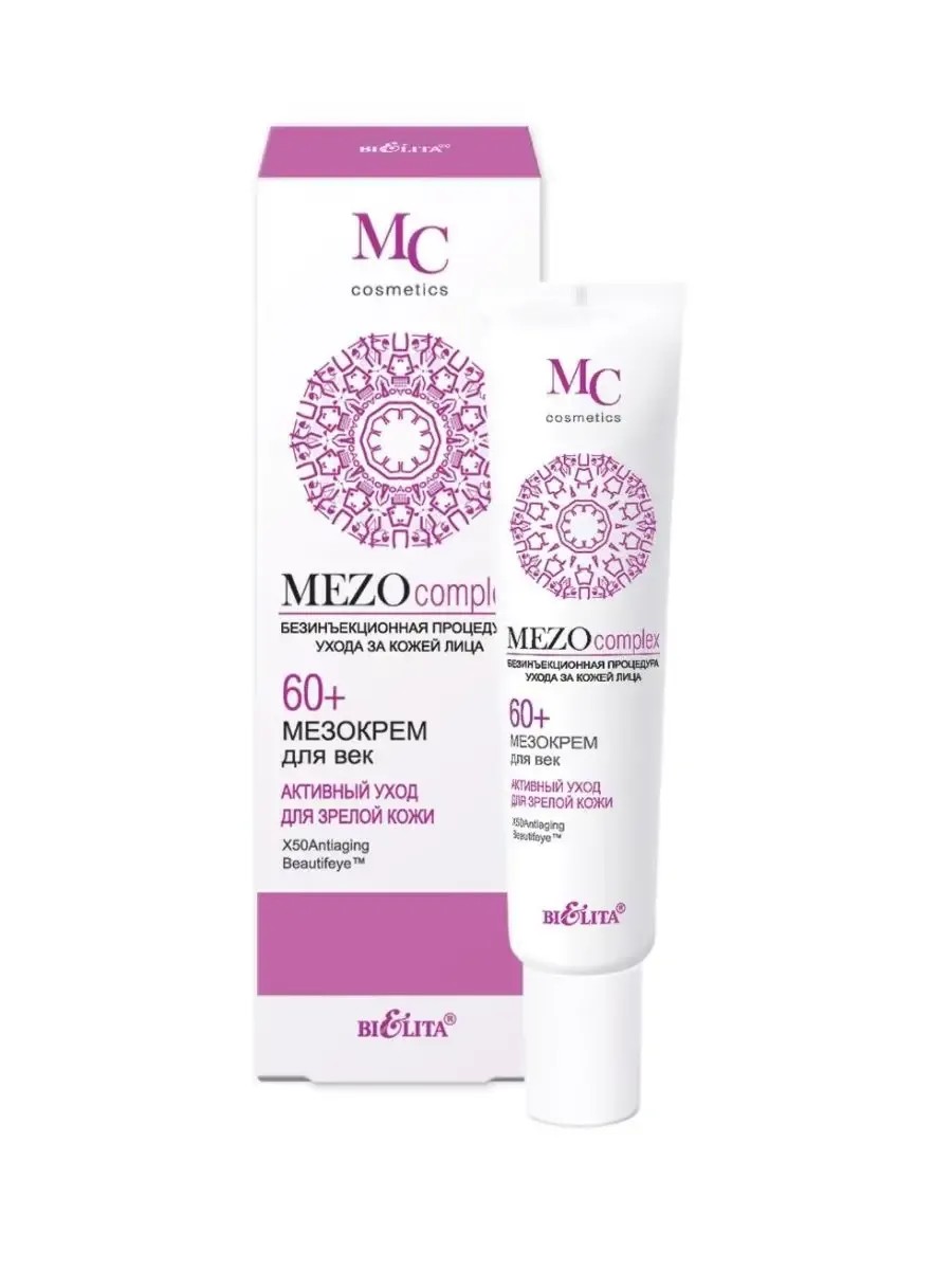 BELITA, Крем Mezo для век 60+ Активный уход для зрелой кожи 20 мл, 1 шт. Beautifeye подтягивает кожу век, разглаживает морщины вокруг глаз, уменьшает припухлости и темные круги под глазами. Гиалуроновая кислота направленного действия проникает в глубокие слои эпидермиса, обеспечивает видимый эффект разглаживания морщин путем выталкивания их изнутри, оказывая действие подобное салонной процедуре мезотерапии. X50Antiaging - "умный" пептид, точно определяющий возрастные изменения кожи - стимулирует клетки кожи к обновлению и омоложению, эффективно разглаживает морщины, увеличивает синтез коллагена и эластина. Кофеин стимулирует микроциркуляцию кожи, уменьшает отечность вокруг глаз. Масло косточек персика интенсивно увлажняет и смягчает кожу, восстанавливает ее защитные функции.