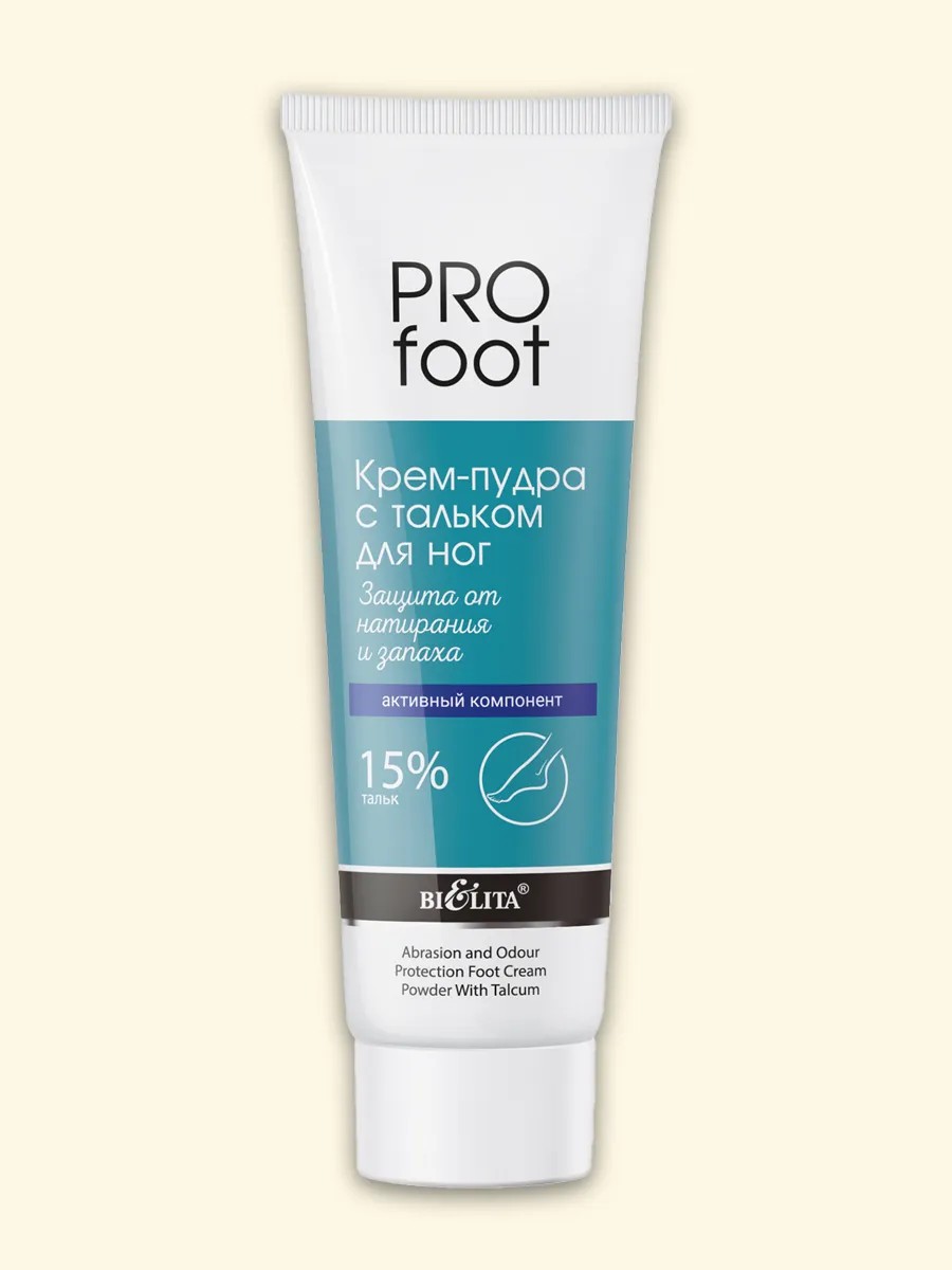 15% talc. This foot cream-powder provides maximum protection against odor and sweat all day long. Talc is highly absorbent, has an antiseptic effect, absorbs odor well, imparts a feeling of freshness and comfort, and protects against chafing. Menthol provides a pleasant, light cooling effect and eliminates heaviness in the feet. When applied, this light-textured cream-powder spreads easily, absorbs quickly, and neutralizes odor. Recommended for daily use. Directions: Apply to clean, dry skin of the feet and between the toes with light massaging movements until completely absorbed. Made in Belarus.