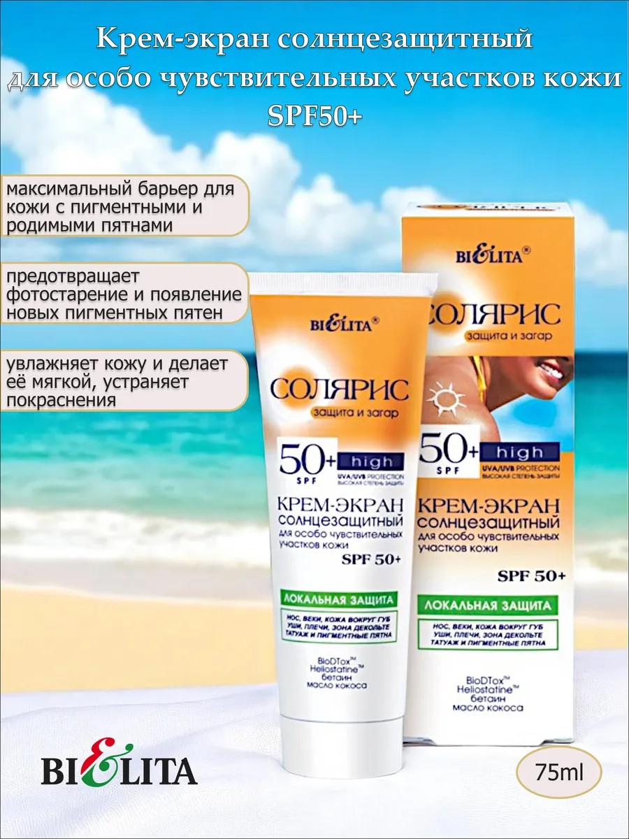 | Комплектация | Крем-экран солнцезащитный для особо чувствительных участков кожи SPF50+ 75мл Belita - 1шт. |