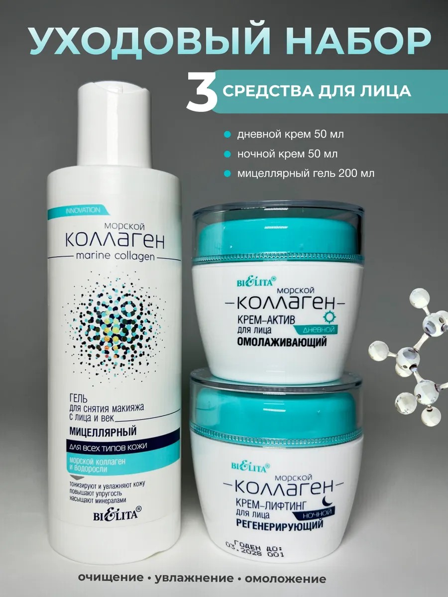 | Комплектация | Мицеллярный гель, дневной крем, ночной крем "Морской коллаген"; подарок |