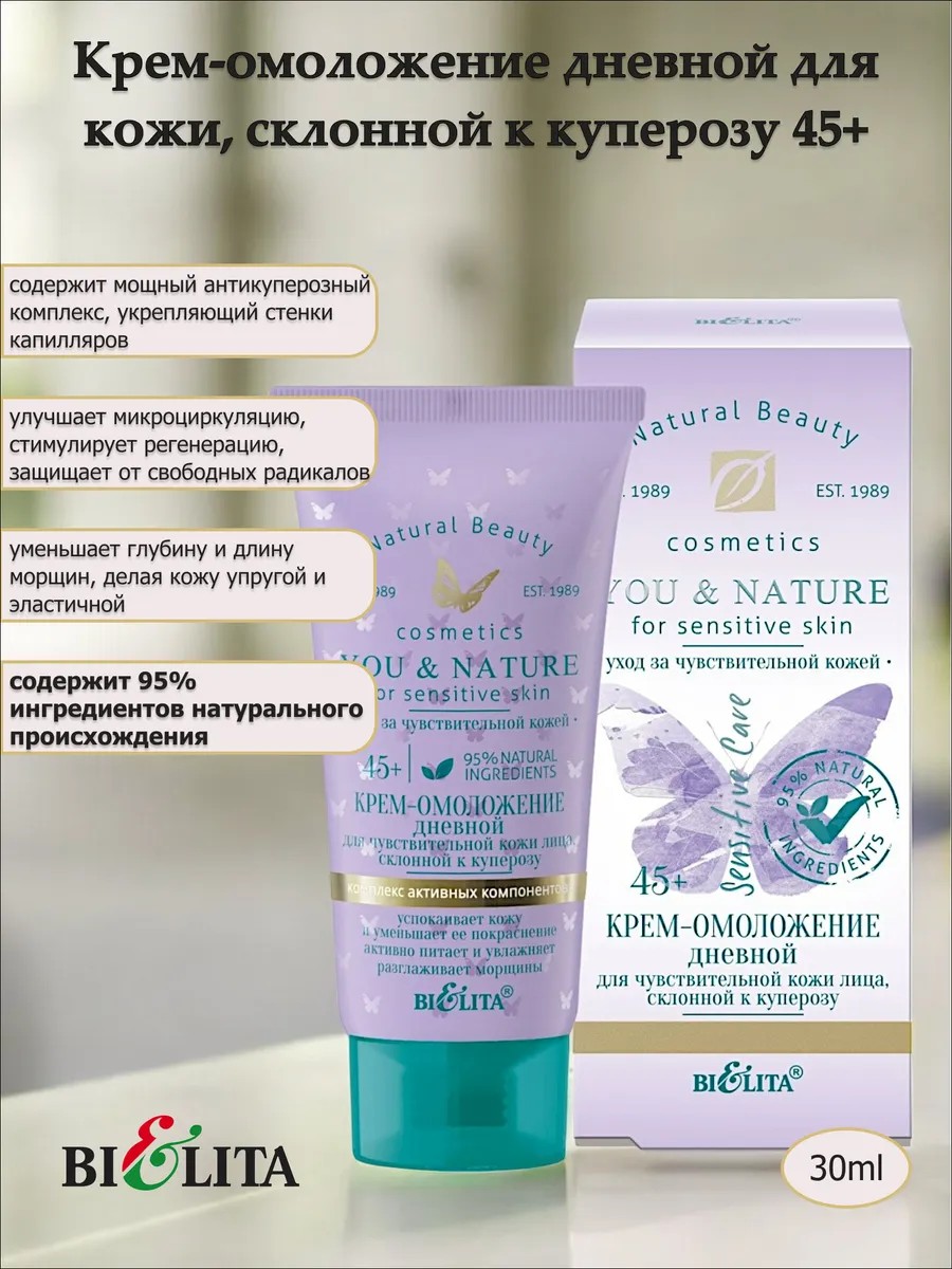 | Полное наименование товара | Крем-омоложение дневной 45+ для чувствительной кожи лица, склонной к куперозу 30мл. Линия You and Nature. Belita |