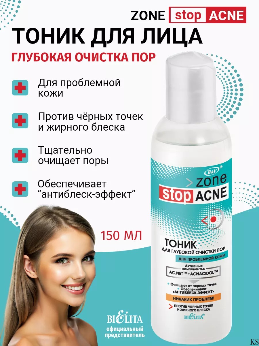 Тоник для глубокой очистки пор против черных точек и жирного блеска от белорусского бренда косметики Белита серия Zone Stop Acne.