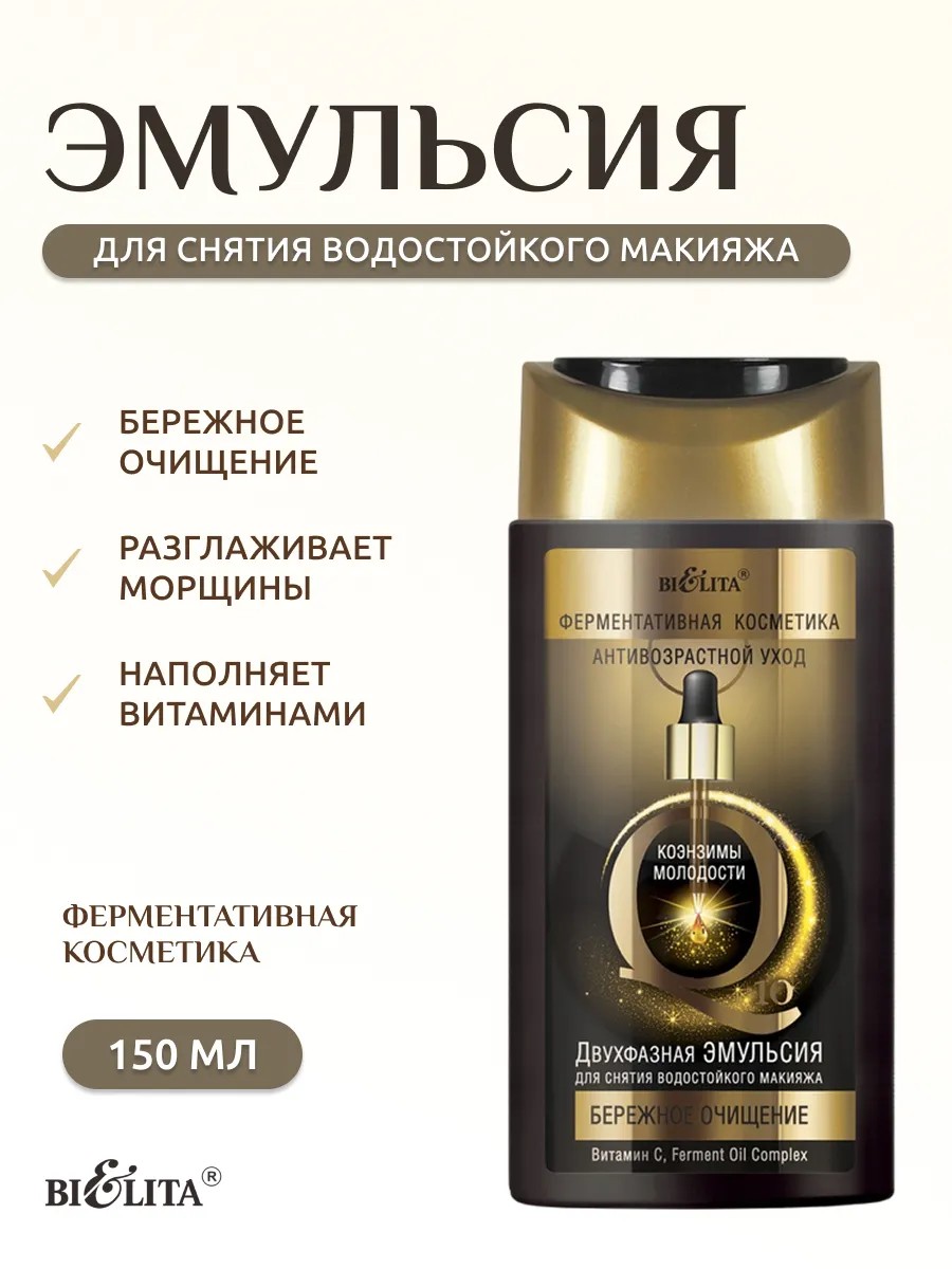 Двухфазная эмульсия для снятия водостойкого макияжа «Бережное очищение» Коэнзимы молодости — это идеальное решение для деликатного очищения кожи. Она эффективно удаляет стойкий макияж, оставляя ощущение свежести и комфорта. Формула эмульсии сочетает в себе мощные активные компоненты, которые заботятся о вашей коже.